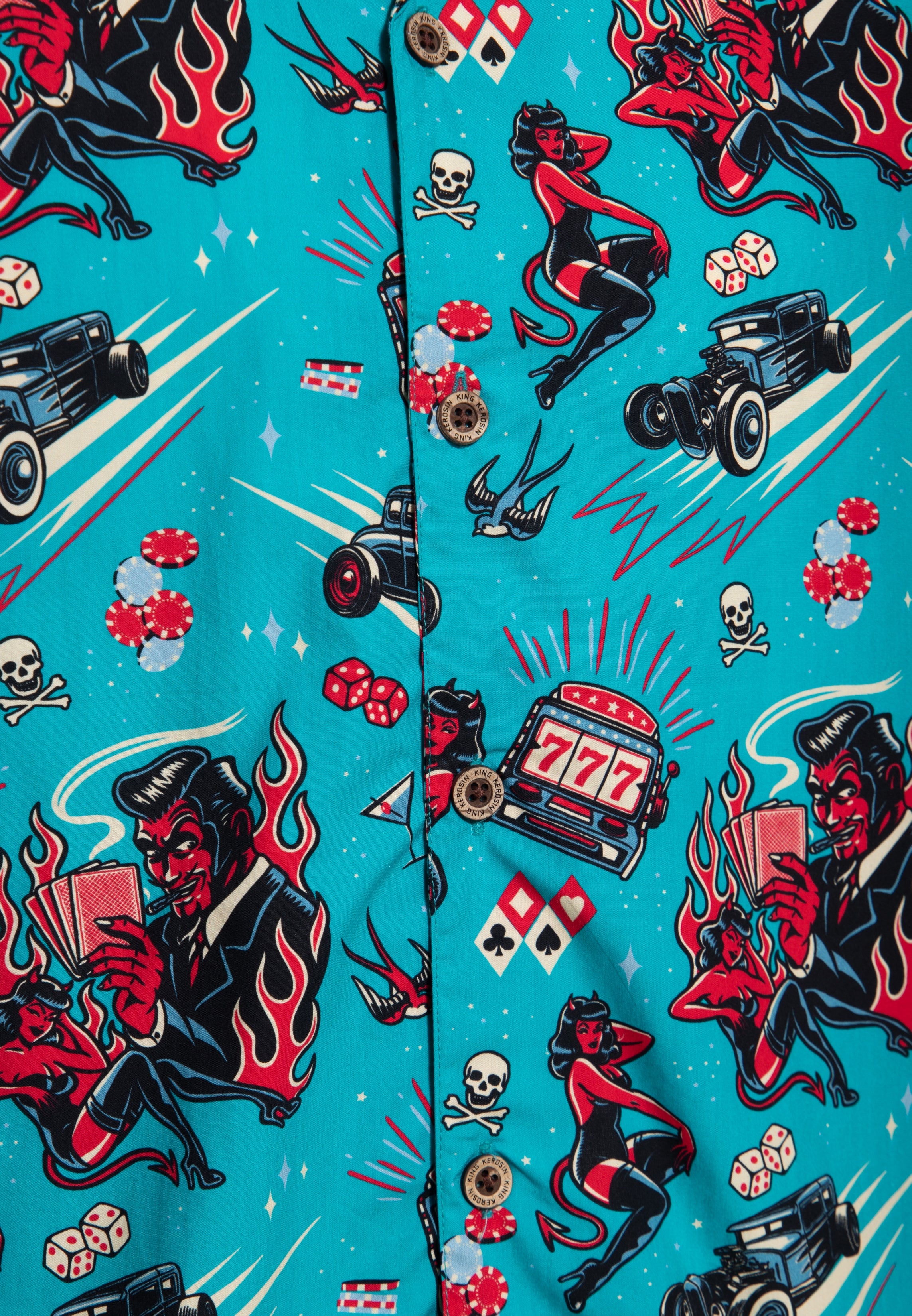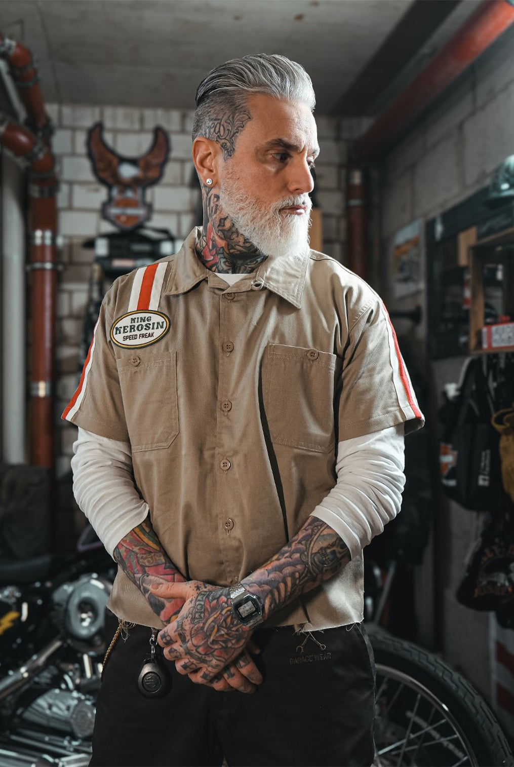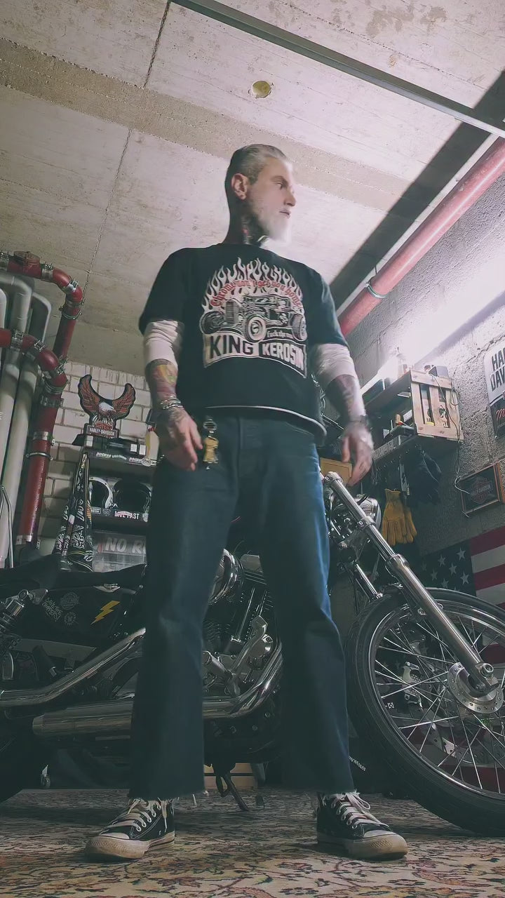 Retro im Herzen, Rock’n’Roll im Blut und scharf wie meine Klingen. King Kerosin ist kein Kram von der Stange, sondern Stoff mit Seele. Ich trag das seit Jahren, weil’s sitzt – rough, echt und mit Charakter. Genau wie ich: bisschen Retro, bisschen Rebell, null Bock auf 08/15.