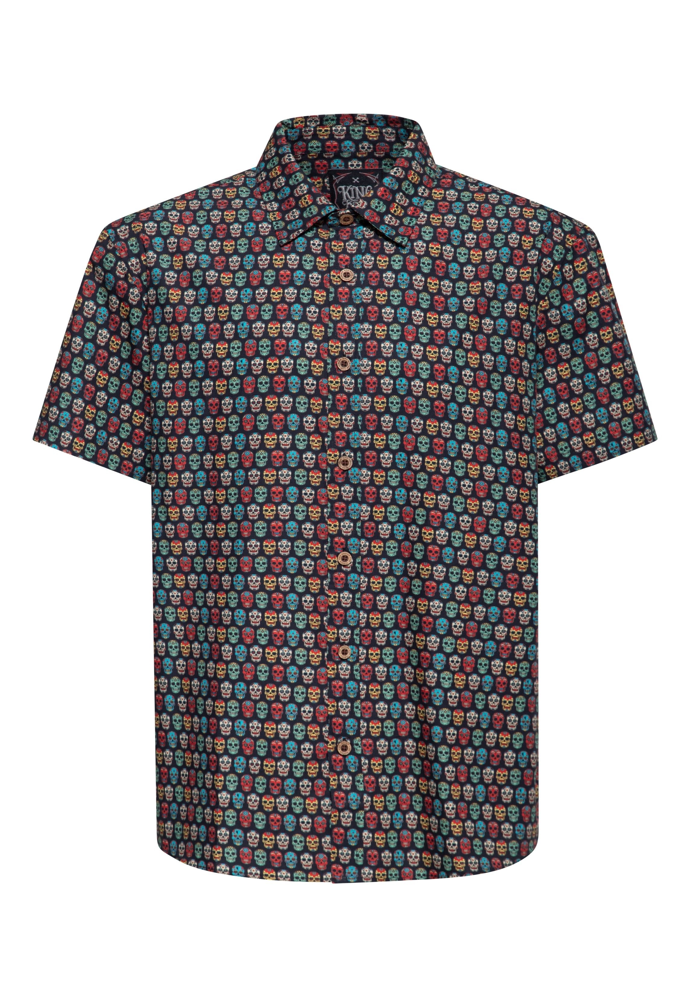 Ein durchgängiges Muster aus kleinen Sugar-Skull-Motiven bestimmt den Look dieses kurzärmeligen Businesshemds von King Kerosin. Der gleichmäßige Allover-Print bringt eine unterschwellige Rebellion in einen ansonsten klaren, aufgeräumten Schnitt. Gefertigt aus reiner Bio-Baumwolle trägt sich die leichte Webware angenehm an warmen Tagen. Klassischer Hemdkragen, Knopfleiste und der abgerundete Saum halten das Hemd sauber im Auftritt und vielseitig im Einsatz. Ein Stilbruch mit Kontrolle – für Büro, Event oder After-Work.
