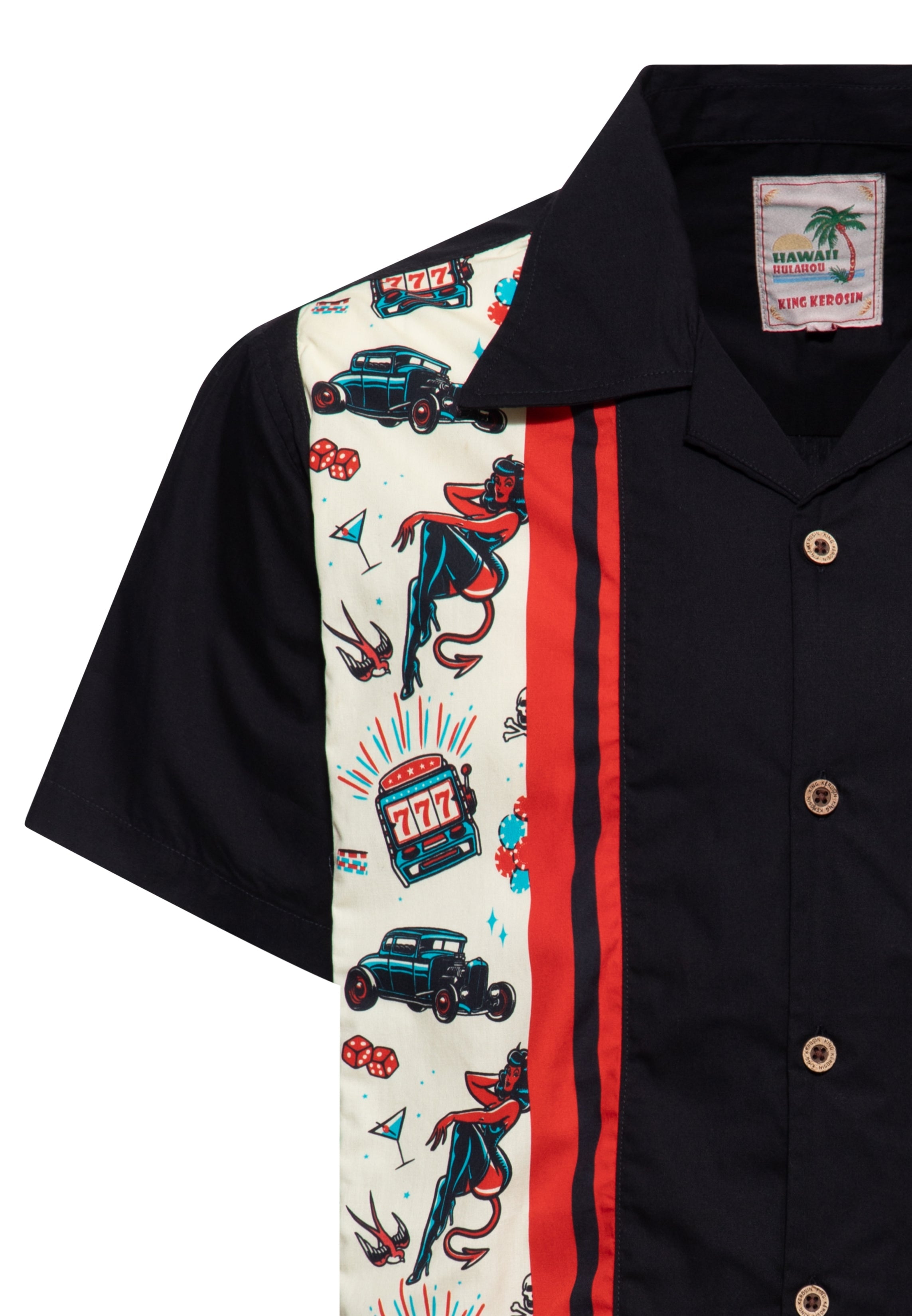 Dieses King Kerosin Hawaiihemd mischt einen cleanen Look mit einem 50s-Gambling-Panel voller Rockabilly-Charme. Reverskragen und Regular Fit halten den Auftritt lässig, die Rückenpasse gibt dir Luft, wenn der Abend länger wird. Gebrandete Knöpfe setzen das Signature-Detail, dazu kommt klassische Hemdqualität als Webware aus reiner Baumwolle – leicht, griffig, bereit für jede Runde. Trag’s offen überm Tee oder zugeknöpft zur Jeans – du entscheidest den Vibe. Vom Drive-In bis zur Late-Night-Bar: Du bringst den Jackpot an den Kragen.