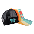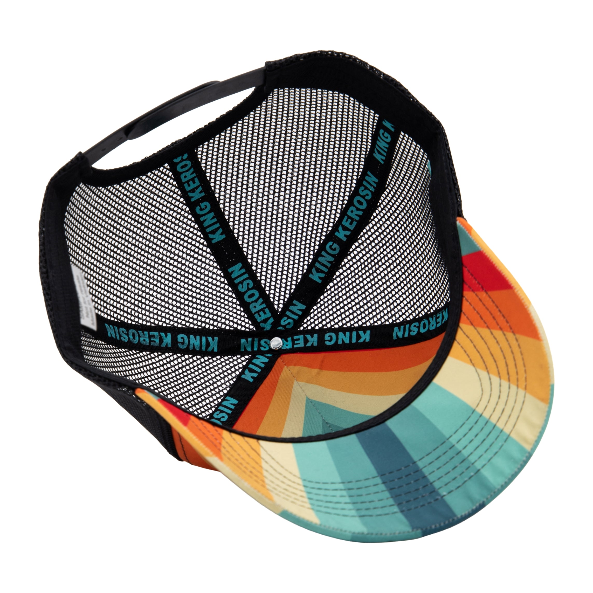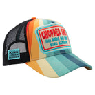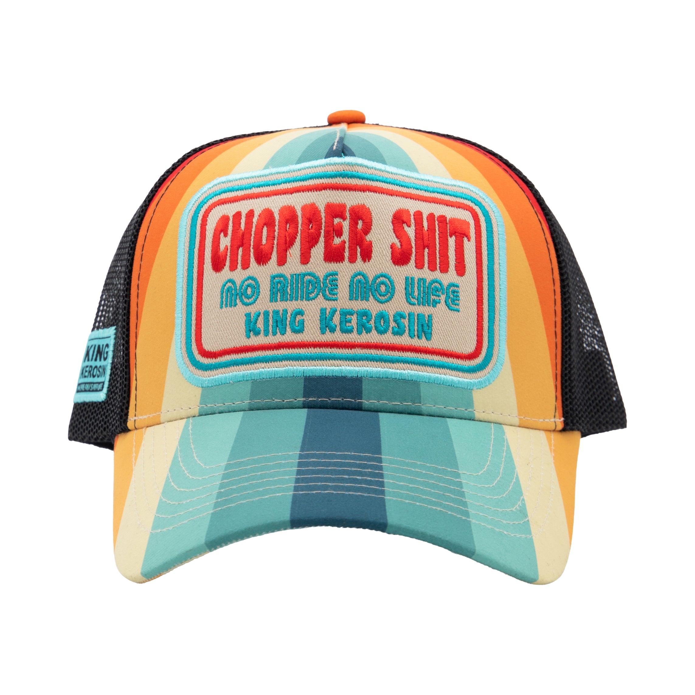Farbige Streifen, Chopper-Attitüde und ein klares Lebensgefühl – diese King Kerosin Trucker Cap bringt sofort Bewegung in den Look. Das großflächige Frontpatch mit hochwertiger Stickerei setzt das Statement selbstbewusst in Szene und wird durch das auffällige Streifen-Design perfekt ergänzt. Der klassisch gebogene Schirm unterstreicht den typischen Trucker-Charakter und überrascht auf der Unterseite mit einem großflächigen Print, der das Design konsequent weiterführt. Die Mesh-Rückseite sorgt für angenehme Luftzirkulation, während gebrandete King-Kerosin-Nahtbänder im Inneren den hochwertigen Eindruck abrunden. Eine Cap für alle, die Farbe bekennen und Chopper-Lifestyle feiern.