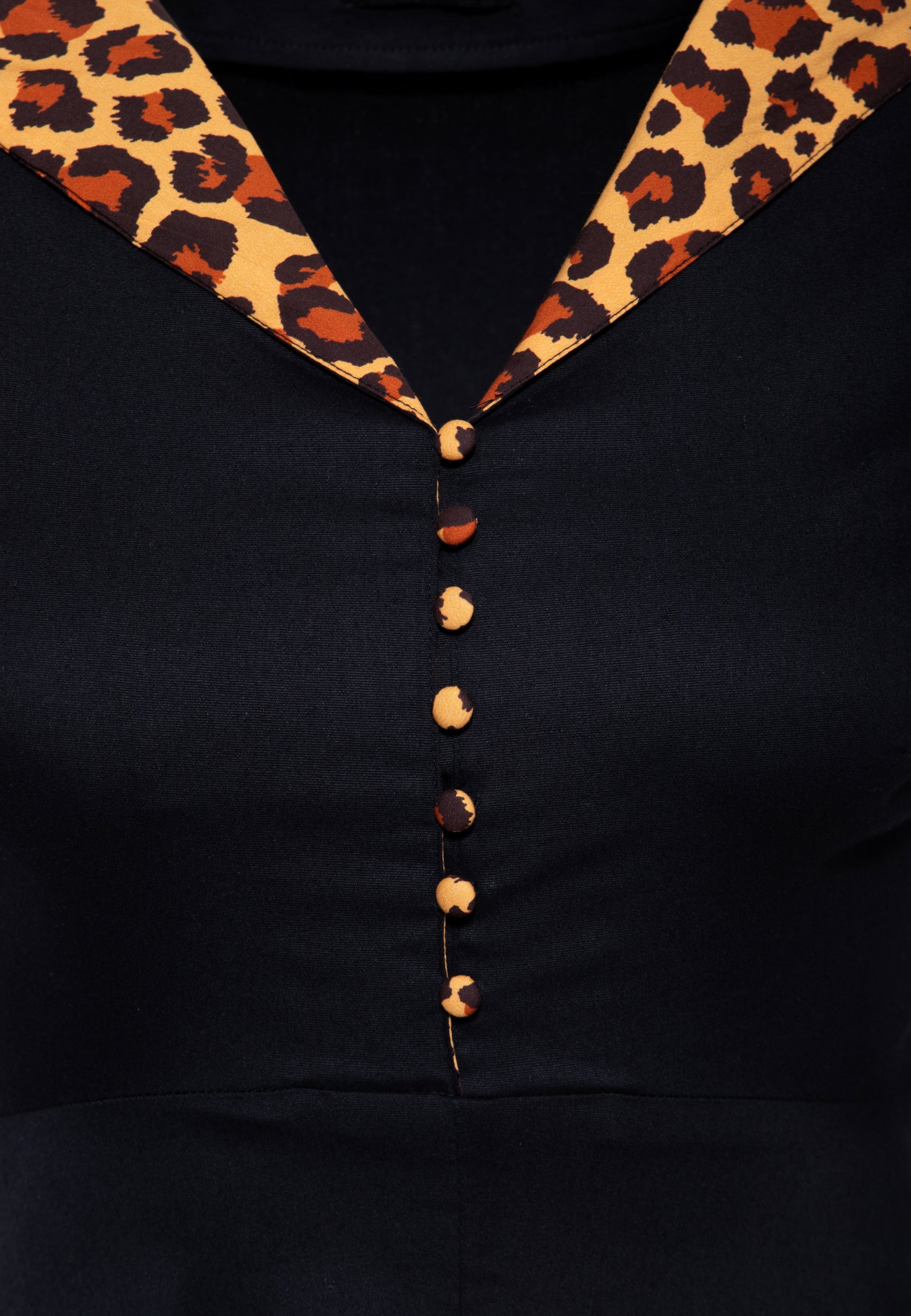 Ein Hauch von Wildheit trifft auf eleganten 50s-Swing! Dieses Queen Kerosin Kleid bringt mit seinem großzügig ausgestellten Rock und den auffälligen Leo-Akzenten am Revers und an den Ärmeln ordentlich Schwung in deinen Vintage-Look. Die stoffbezogenen Knöpfe setzen charmante Akzente, während der elastische Materialmix für eine feminine Passform mit viel Bewegungsfreiheit sorgt. Ob Tanzfläche oder Dinner-Date – hier wird jede Drehung zum Statement.