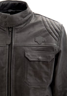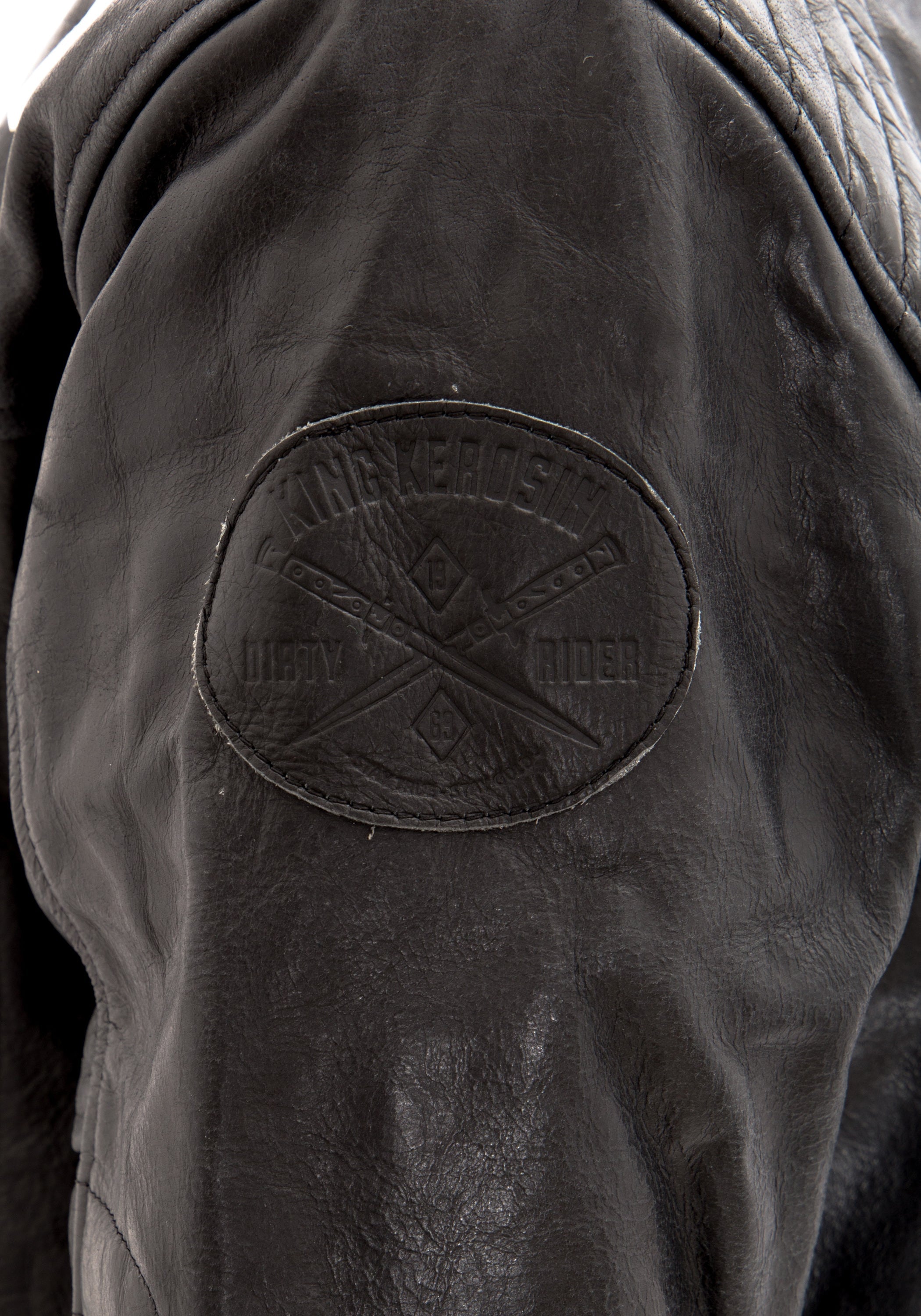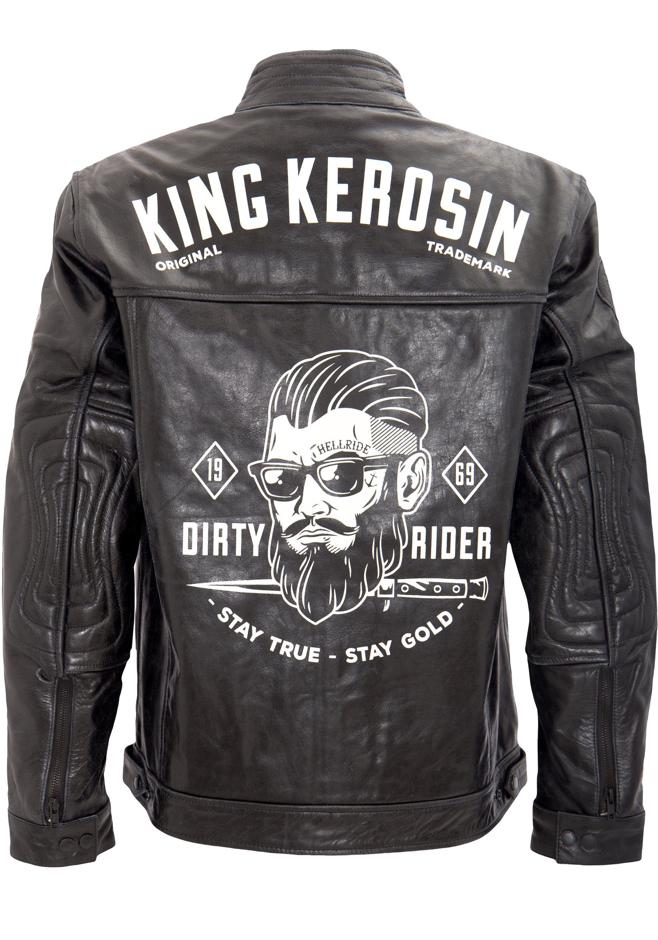 Coole Lederjacke für Motorradfans von King Kerosin mit Vintage Aufdruck Dirty Rider. Logopatches an Arm und Brust und grobe Reißverschlussdetails nehmen einen gedanklich schon mit auf die nächste Tour. Im Rückteilfutter und in den Ärmeln sind Fächer eingenäht in denen sich ganz easy Standard Schulter- und Rückenprotektoren nachrüsten lassen. Doch auch modisch macht die Jacke im Alltag richtig was her: das matte Büffelleder, die coolen Metalldruckknöpfe und natürlich der Aufdruck im Rücken sind Highlights der Jacke, die den Unterschied machen. Drei aufgesetzte und eine Reißverschlusstasche im Vorderteil sorgen für den nötigen Stauraum, zusätzlich findet sich im Futter noch eine Reißverschlusstasche für Geldbeutel oder Schlüssel. Saum und Ärmel sind durch zusätzliche Druckknöpfe Weiten regulierbar. Teilungsnähte und für den Biker Stil typische Steppungen an Ellenbogen und Schulter runden das coole Design gekonnt ab und schützen zusätzlich mit innen liegenden Verstärkungen. Stilecht kombiniert mit Jeans und Boots wird die Lederjacke von King Kerosin zum langlebigen Lieblingsstück auf dem Bike oder in der Freizeit.