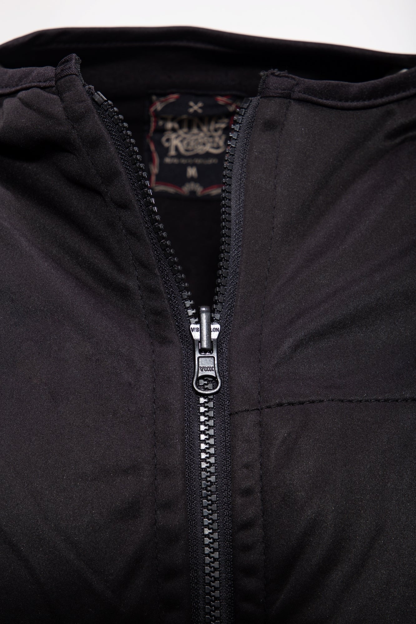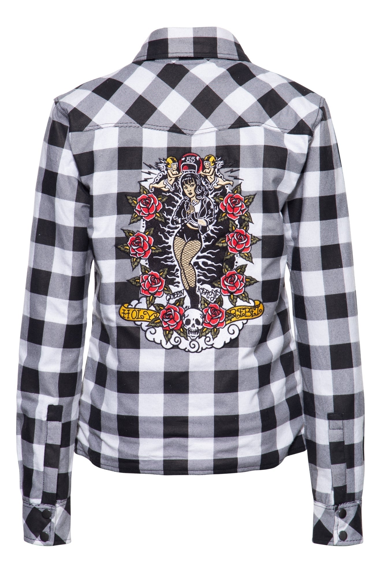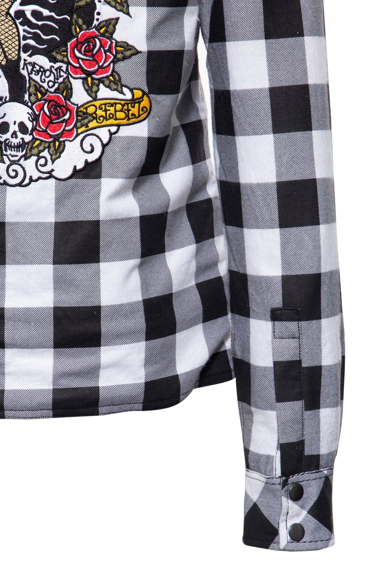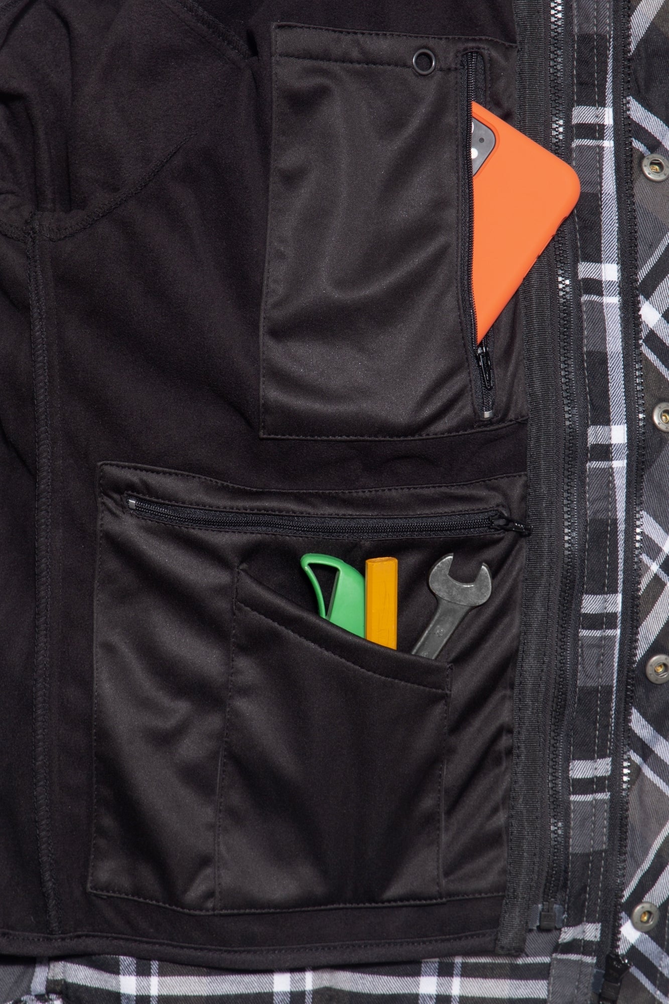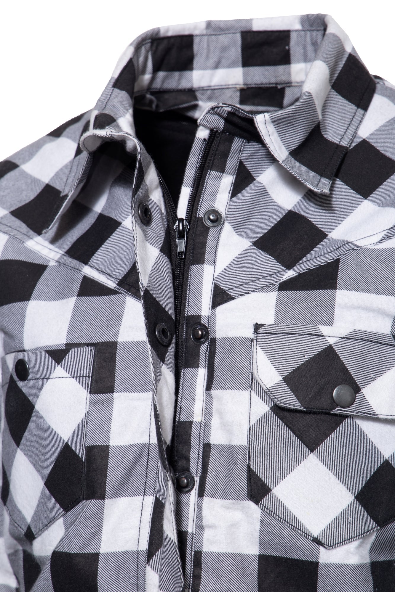 Egal ob als Hemd getragen oder mit dem Softshell-Innenfutter als Jacke, das Funktionshemd von Queen Kerosin macht einiges her. Optisch kann es mit seinem rustikalen Karomuster in Holzfäller-Optik und seiner hochwertigen Stickerei im Rücken überzeugen. Das Hemd verfügt über einen klassischen Kragen und Manschetten, die jedoch wie die Knopfblende einige Raffinessen aufweisen. Sie sind mit Ärmelschlitzen versehen, welche sich per Reißverschluss schließen lassen. Auch die vordere Mitte lässt sich mit einem Reißverschluss schließen, der durch die Knopfblende mit Druckknöpfen verdeckt wird. Das Obermaterial besteht aus reiner, weicher Baumwolle, was zusammen mit dem bequemen Straight Fit für großartigen Komfort sorgt. Nun zu der Funktionalität: Das langarm Funktionshemd von King Kerosin verfügt über ein separates Innenfutter aus wind- und wasserabweisendem Softshell, das ja nach Bedarf komplett herausgetrennt und wieder eingesetzt werden kann.