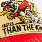 Wenn Stillstand für dich keine Option ist, brauchst du eine Cap, die mithält. Mit dem frechen Roadrunner und dem gestickten „FASTER THAN THE WIND“-Motiv zeigt diese King Kerosin Trucker Cap, wo’s langgeht. Der rote Schirm setzt ein markantes Farbstatement, das beigefarbene Frontpanel sorgt für Retro-Vibes und der schwarze Mesh-Einsatz bringt die nötige Portion Coolness. Durch das luftige Netzmaterial und den verstellbaren Snapback-Verschluss sitzt die Cap jederzeit bequem – ganz gleich, wie viel Tempo du machst.