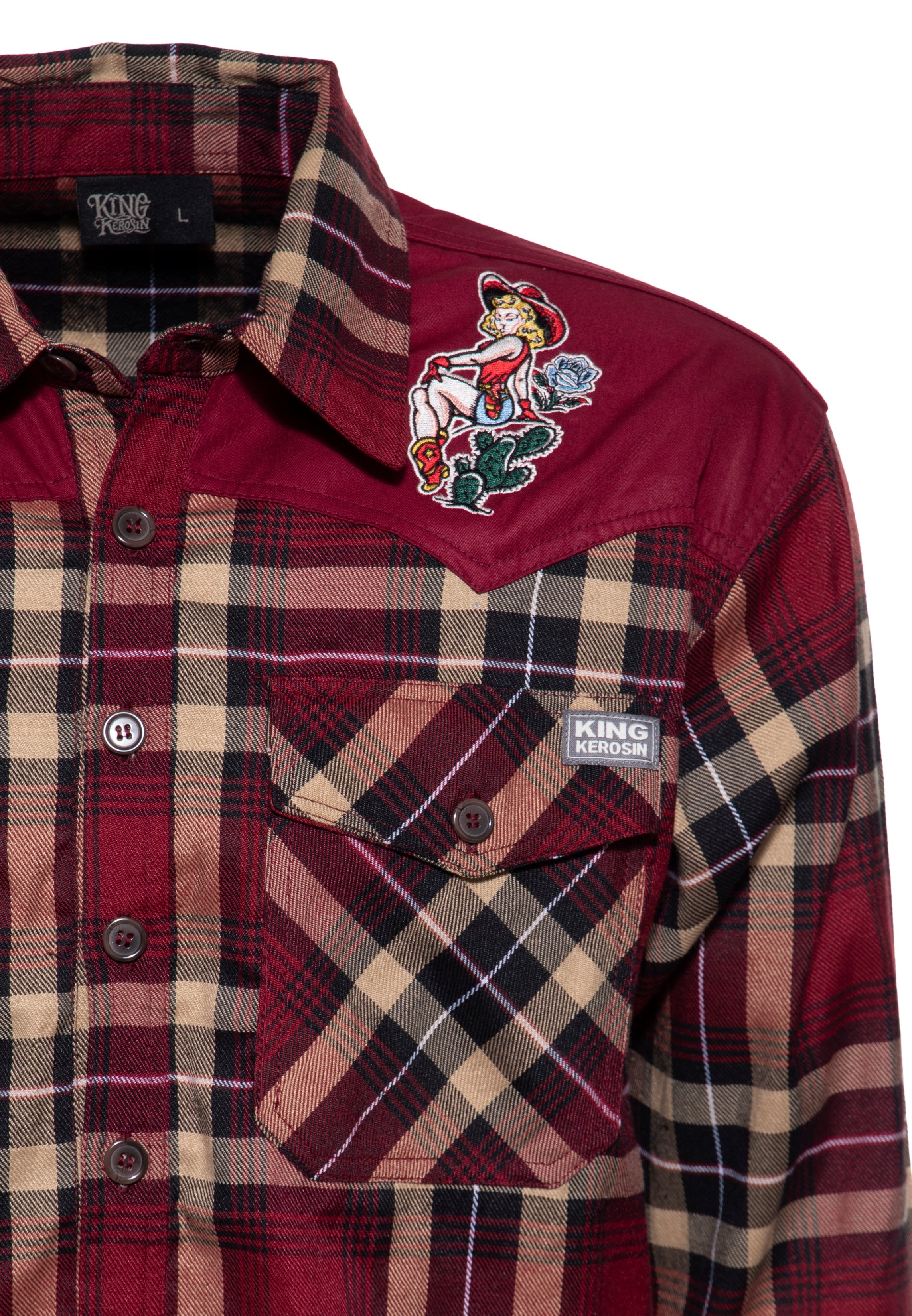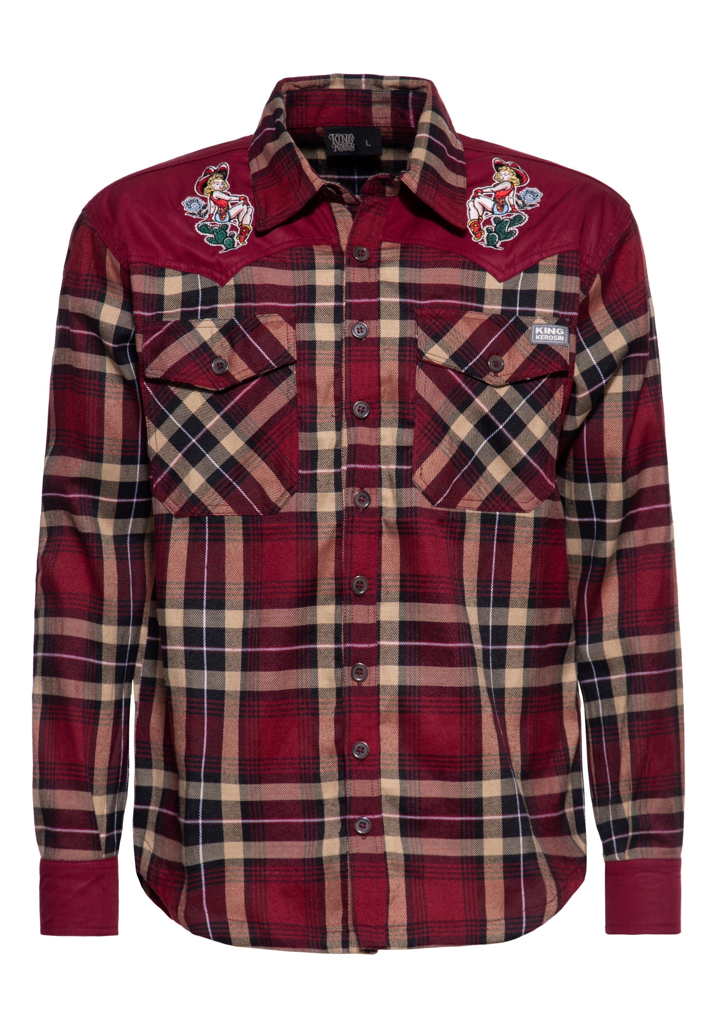Mit diesem King Kerosin Langarmhemd holst du dir echtes Western-Feeling in deinen Style! Das auffällige Karomuster trifft auf eine kontrastierende Schulterpasse und verleiht dem Flanellhemd einen kernigen Charakter. Die aufgestickten Cowgirl-Motive setzen dabei ein freches Highlight, das sofort ins Auge fällt. Aus weichem Baumwollstoff gefertigt, bietet es angenehmen Tragekomfort und bleibt gleichzeitig strapazierfähig. Mit Regular Fit, abgerundetem Saum und praktischen Brusttaschen kannst du das Hemd offen oder zugeknöpft tragen – perfekt für Freizeit, Roadtrips oder den nächsten Rock’n’Roll-Abend.