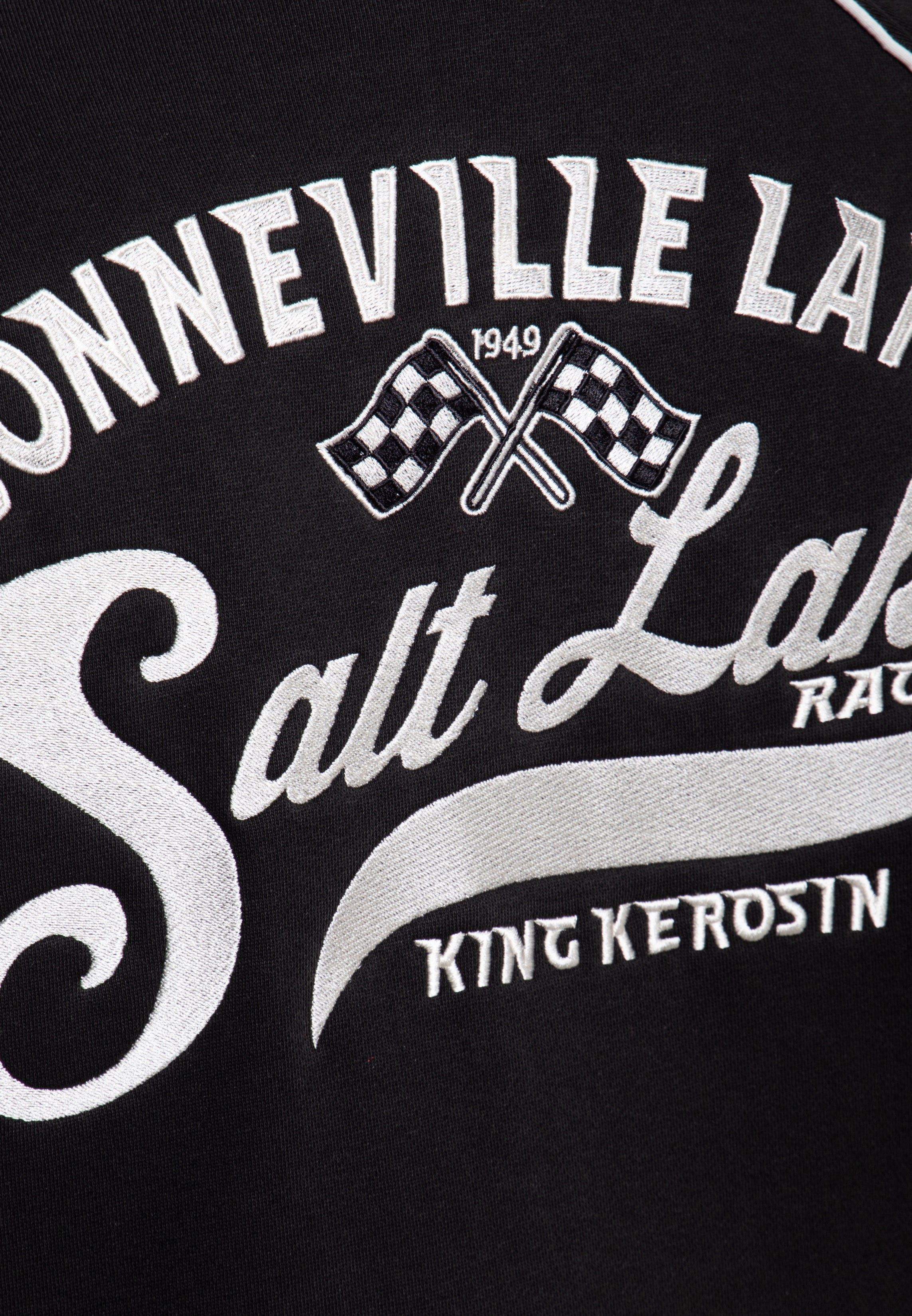 Bonneville ruft! Diese Collegejacke von King Kerosin bringt echtes Salt-Lake-Speedway-Feeling auf deinen Rücken. Der großflächige Rückenstick „Salt Lake – Bonneville Land“ mit Flaggen und Racing-Schriftzug verpasst deinem Look eine Extraportion Adrenalin. Auf der Brust sorgt das zweifarbige KK-Patch in Chenille für den passenden Varsity-Vibe. Die kontrastfarbene Paspelierung an den Raglanärmeln unterstreicht den sportlichen Charakter. Eingrifftaschen, elastische Rippbündchen und die weich angeraute Innenseite sorgen für Komfort mit Stil – ready for the next race!