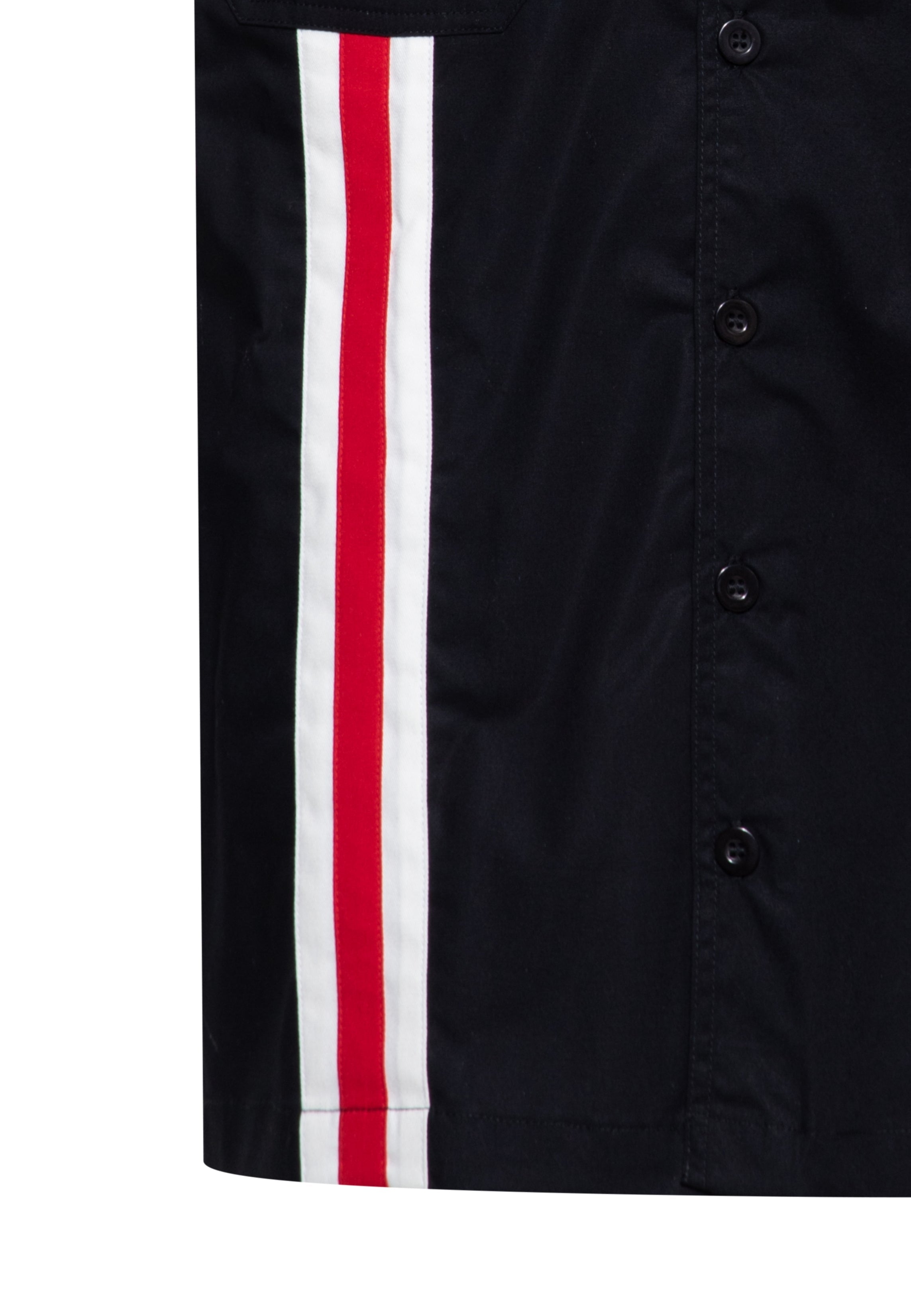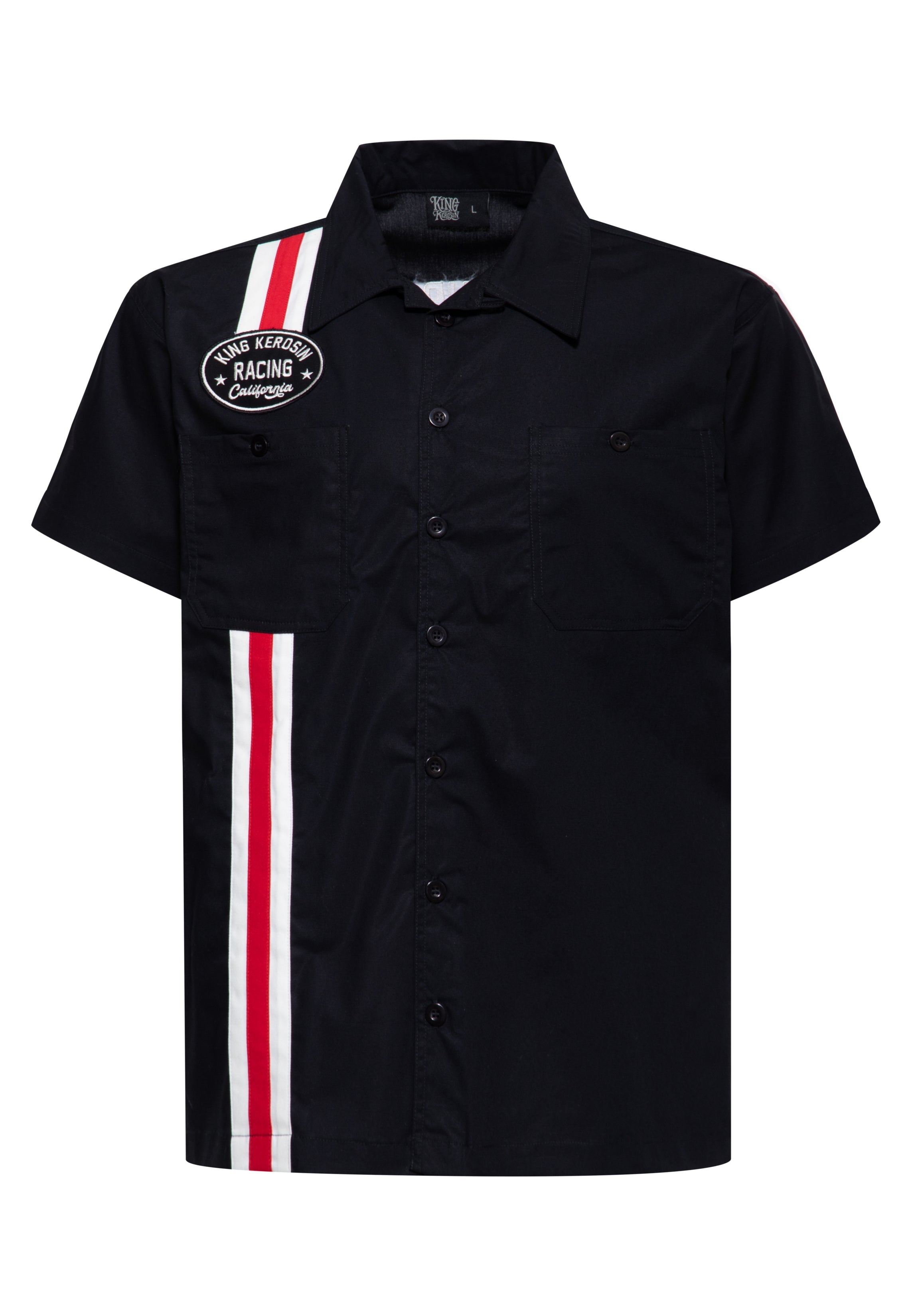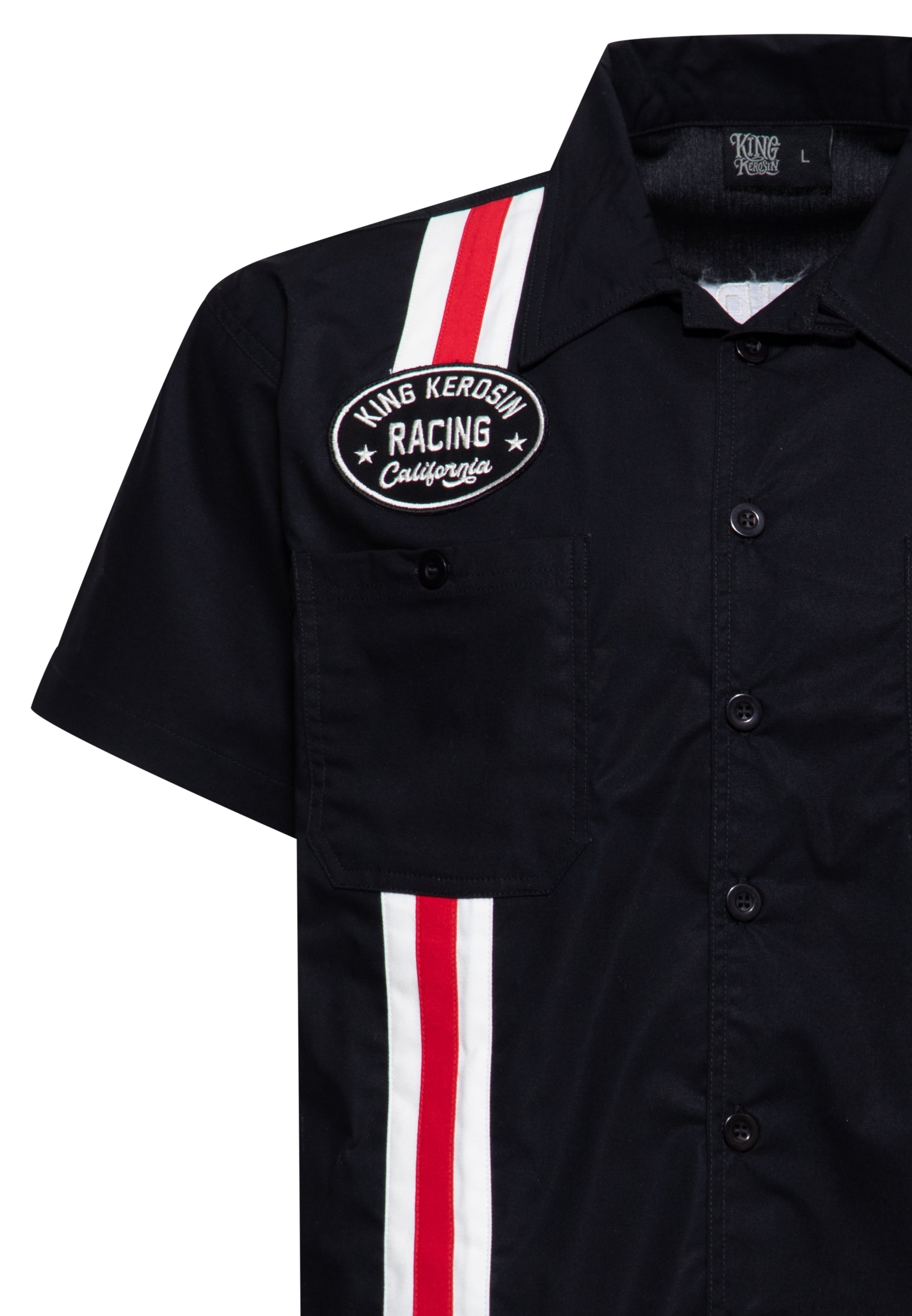 Dragstrip-Vibes für deinen nächsten Run: Das King Kerosin Kurzarmhemd setzt mit dem rot-weißen Racing-Streifen und dem Brust-Patch „King Kerosin Racing California“ ein klares Statement. Auf dem Rücken sorgt die große Stickerei „Speed is our passion – Los Angeles, California“ für den Extra-Push. Dank Kentkragen, Knopfleiste und Brusttaschen sitzt der Style so souverän wie ein Pit-Crew-Uniformteil – klar definiert, alltagstauglich und mit echtem Racing-Flair. Gefertigt aus reiner Baumwolle für angenehmen Tragekomfort. Trag es geschlossen oder locker offen, am besten lässig über der Hose.