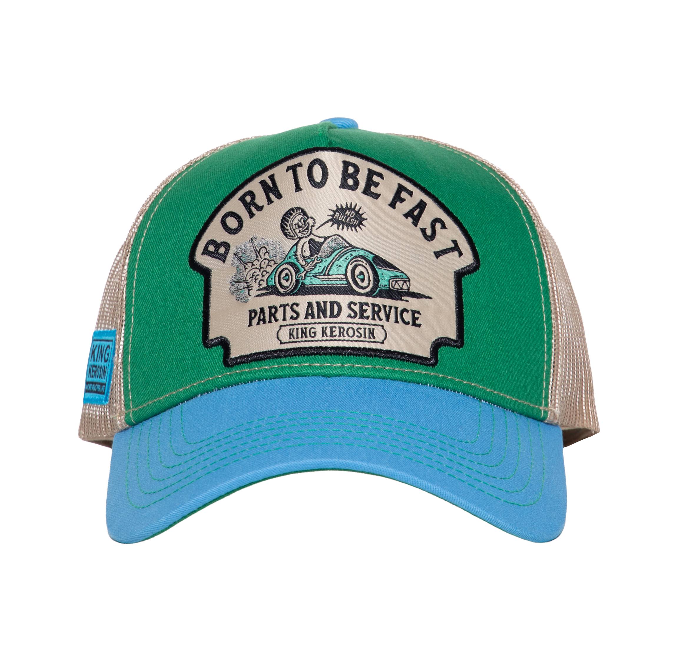 Diese Cap ist kein Accessoire – sie ist ein Aufruf zur Höchstgeschwindigkeit! Die „Born to be fast“-Stickerei mit Comic-Racer bringt deine Liebe zu Speed, Style und Schraubergarage auf den Punkt. Der frische Farbmix aus Grün, Hellblau und Beige sorgt für gute Laune, das Mesh hinten für kühlen Kopf. Ob Boxengasse oder Biergarten – mit dieser Trucker Cap von King Kerosin bist du immer auf der Überholspur. Ready, steady, go!