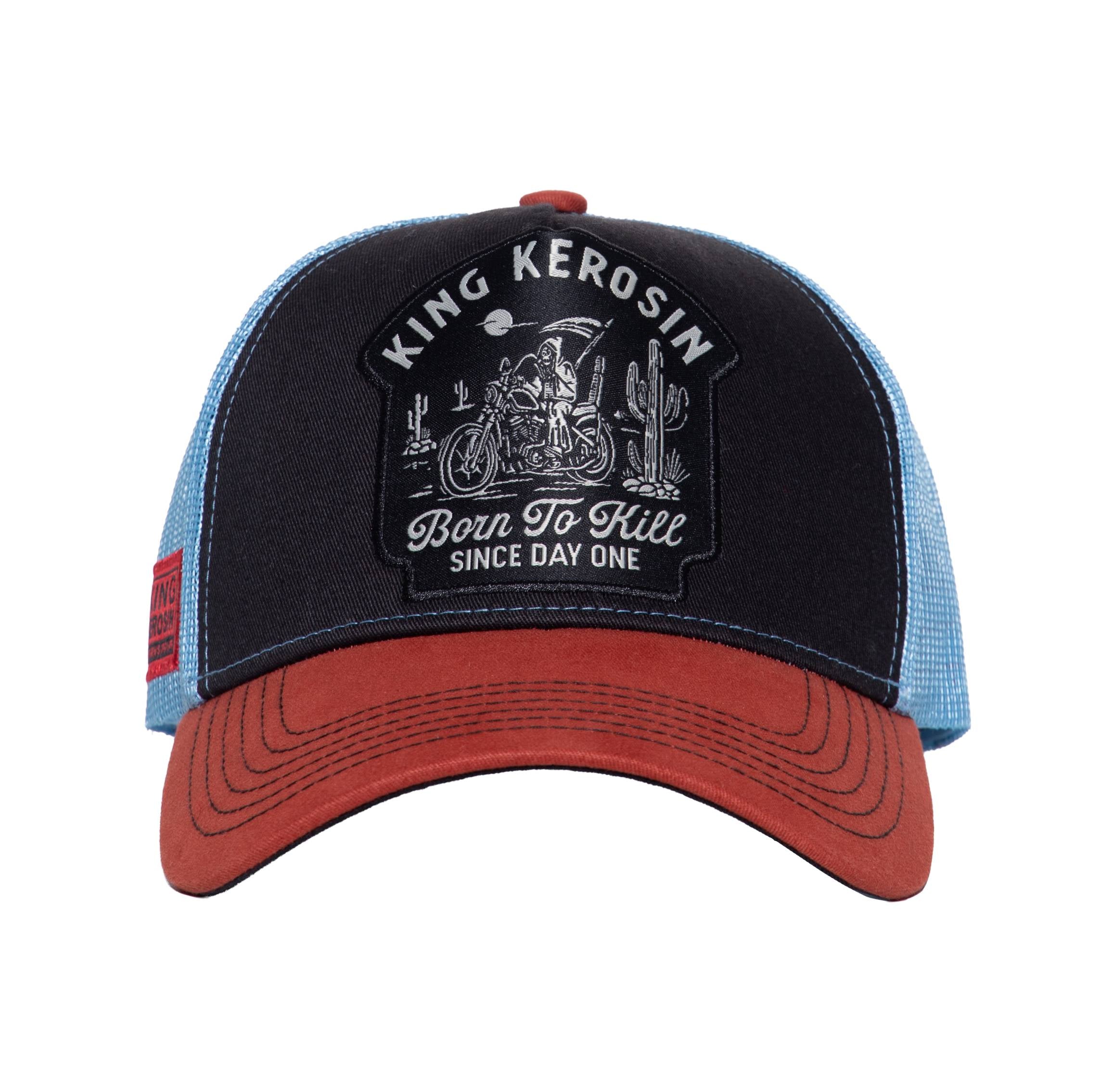 Diese Cap schreit nach Abenteuer – der „Born To Kill“-Stick auf der Front bringt die Message auf den Punkt: Hier fährt niemand im Schongang! Das Design zeigt einen furchtlosen Rider zwischen Kakteen und Sand – ganz klar inspiriert von staubigen Highways und wilden Roadtrips. Die Kombination aus schwarzer Front, hellblauem Mesh und rostrotem Schirm sorgt für einen markanten Look. Dank Snapback-Verschluss sitzt die Cap genau so, wie du’s brauchst. Ein Statement für alle, die das Leben mit Vollgas angehen.