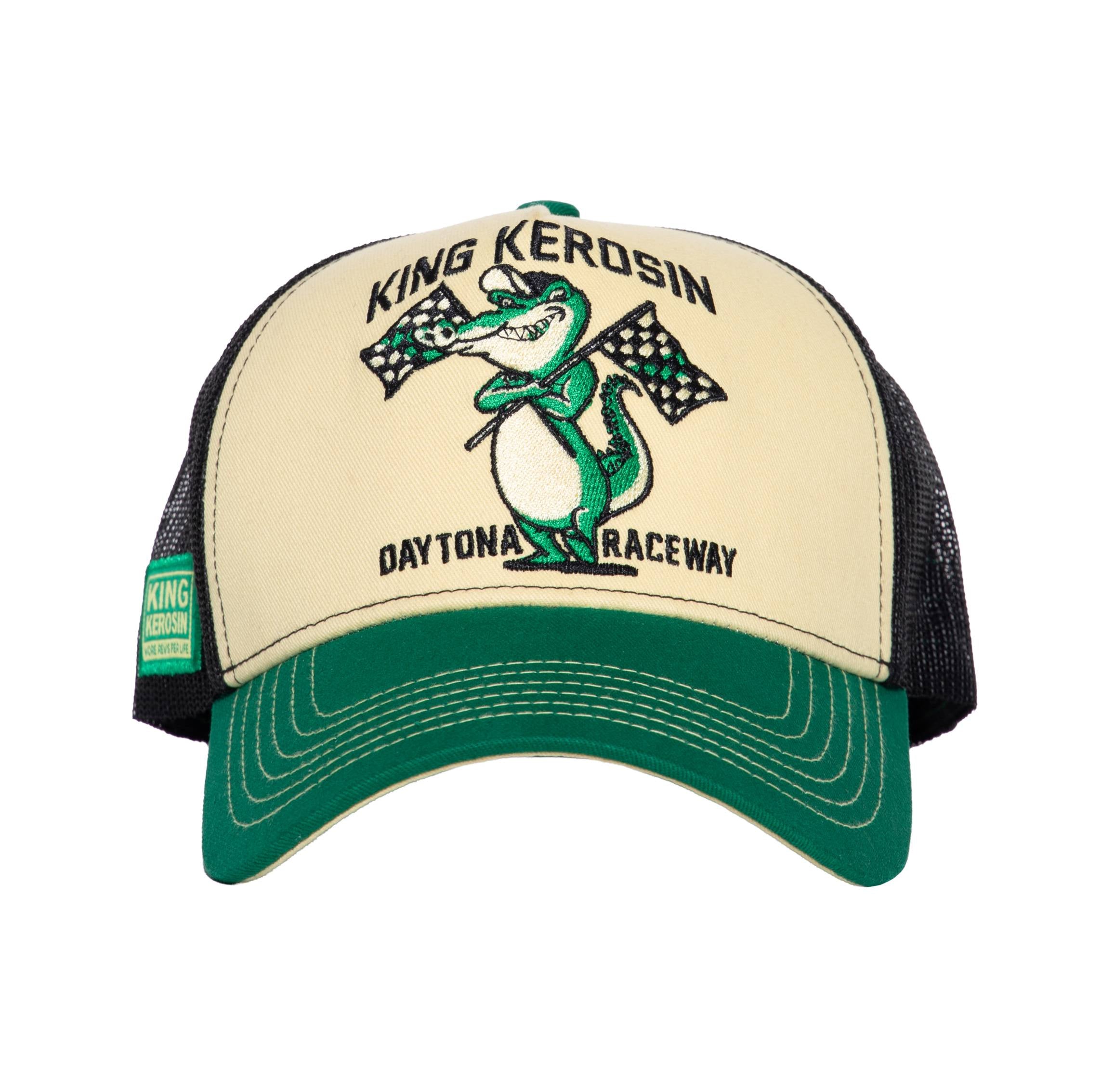 Ob du auf der Rennstrecke unterwegs bist oder einfach nur durchs Leben cruised – mit dieser King Kerosin Trucker Cap bringst du gute Laune in Pole Position. Der grinsende Gator mit den Zielflaggen auf der Stirnfläche sorgt für Racing-Vibes mit einem Augenzwinkern. Das beigefarbene Frontpanel trifft auf einen kräftig grünen Schirm, der schwarzen Mesh-Einsatz am Hinterkopf ergänzt – fertig ist der perfekte Mix aus Retro-Rennsport und Streetstyle. Dank Snapback-Verschluss lässt sich die Cap individuell anpassen, das Mesh sorgt für frische Luft bei jeder Geschwindigkeit.