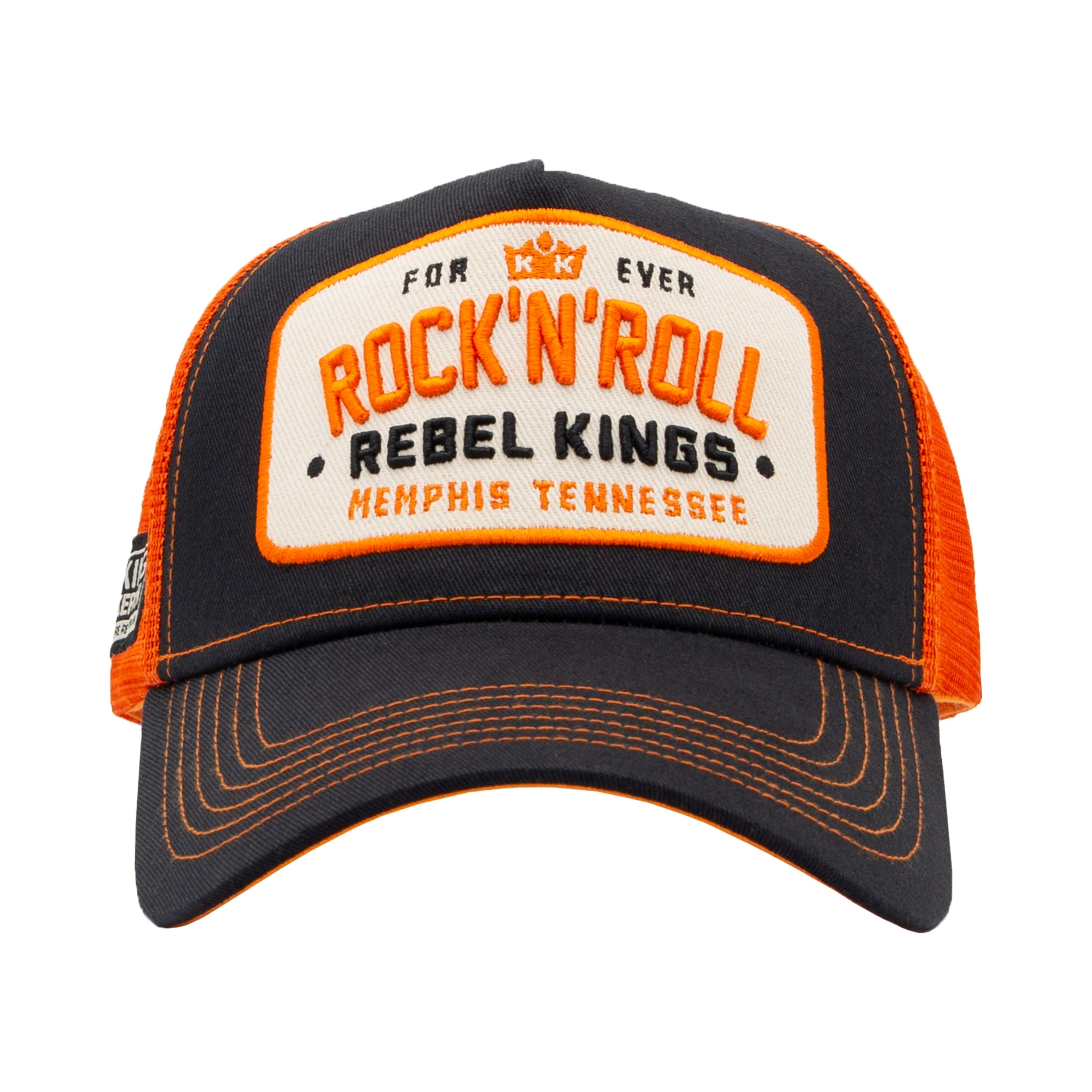 Spüre den Geist des Rock'n'Roll mit der King Kerosin "Rebel Kings" Cap. Diese Trucker Cap verkörpert die rebellische Energie von Memphis, Tennessee, einem der Geburtsorte des Rock'n'Roll. Sie kombiniert ein klassisches Schwarz mit lebhaft orangenem Netzteil und passenden Nähten, die sofort ins Auge stechen.