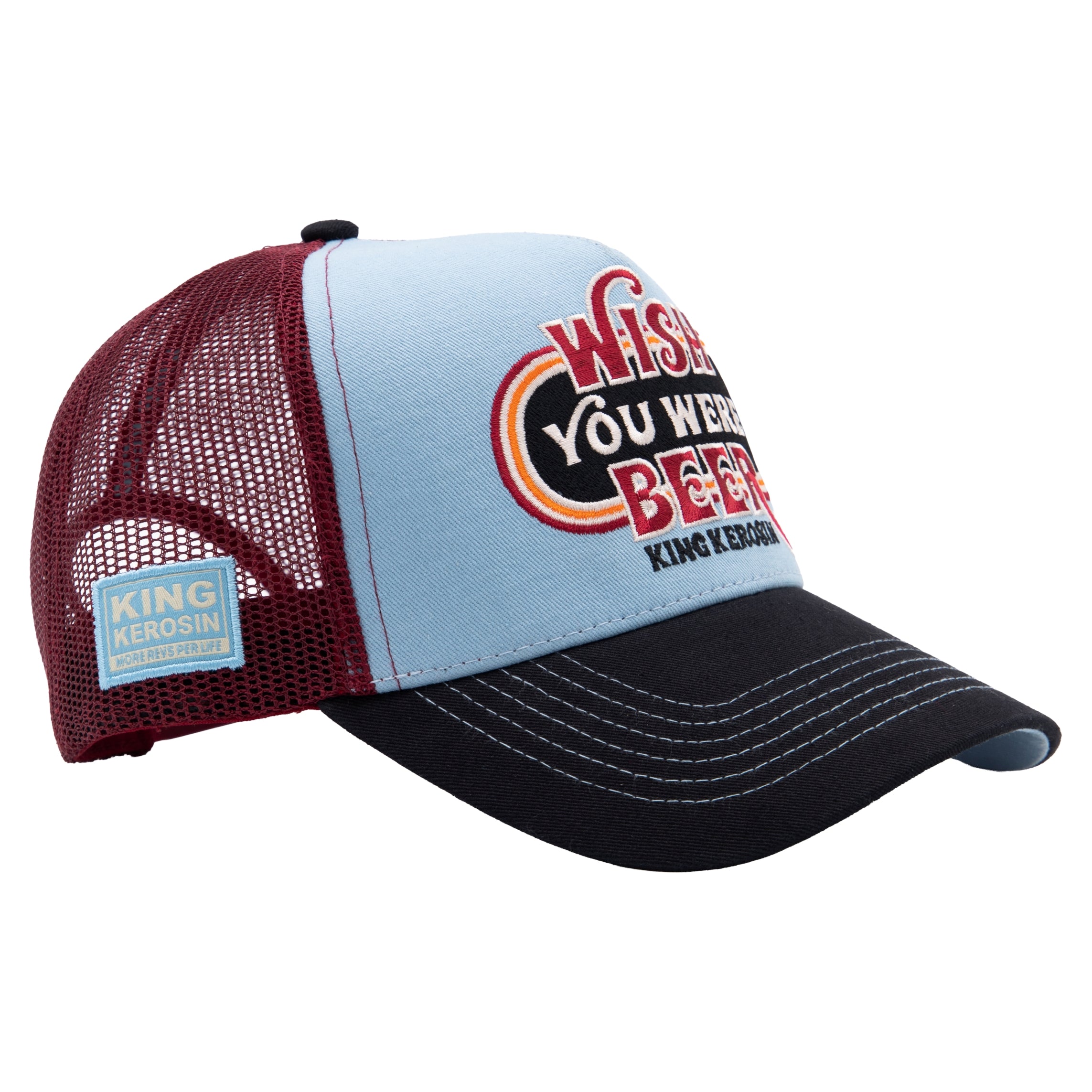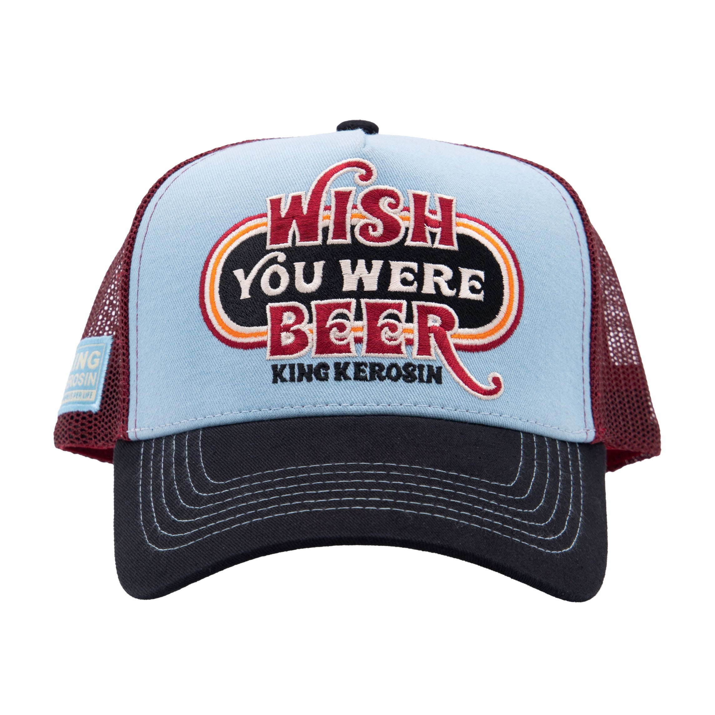 Ein augenzwinkernder Spruch trifft auf klassischen Trucker-Style. Diese King Kerosin Cap bringt entspannte Vibes auf den Punkt und bleibt dabei angenehm tragbar im Alltag. Die strukturierte Front sorgt für Formstabilität, während die Mesh-Rückseite für eine gute Luftzirkulation steht. Auf der Front sitzt ein hochwertiger 3D-Stickpatch mit dem Schriftzug „Wish You Were Beer“, der dem Design seinen spielerischen Charakter verleiht. Abgerundet wird der Look durch den gebogenen Schirm und ein seitlich angebrachtes King-Kerosin-Label. Im Inneren sind gebrandete Nahtbänder mit King-Kerosin-Schriftzug verarbeitet, zudem ist die Frontstickerei von innen mit Stoff unterlegt.