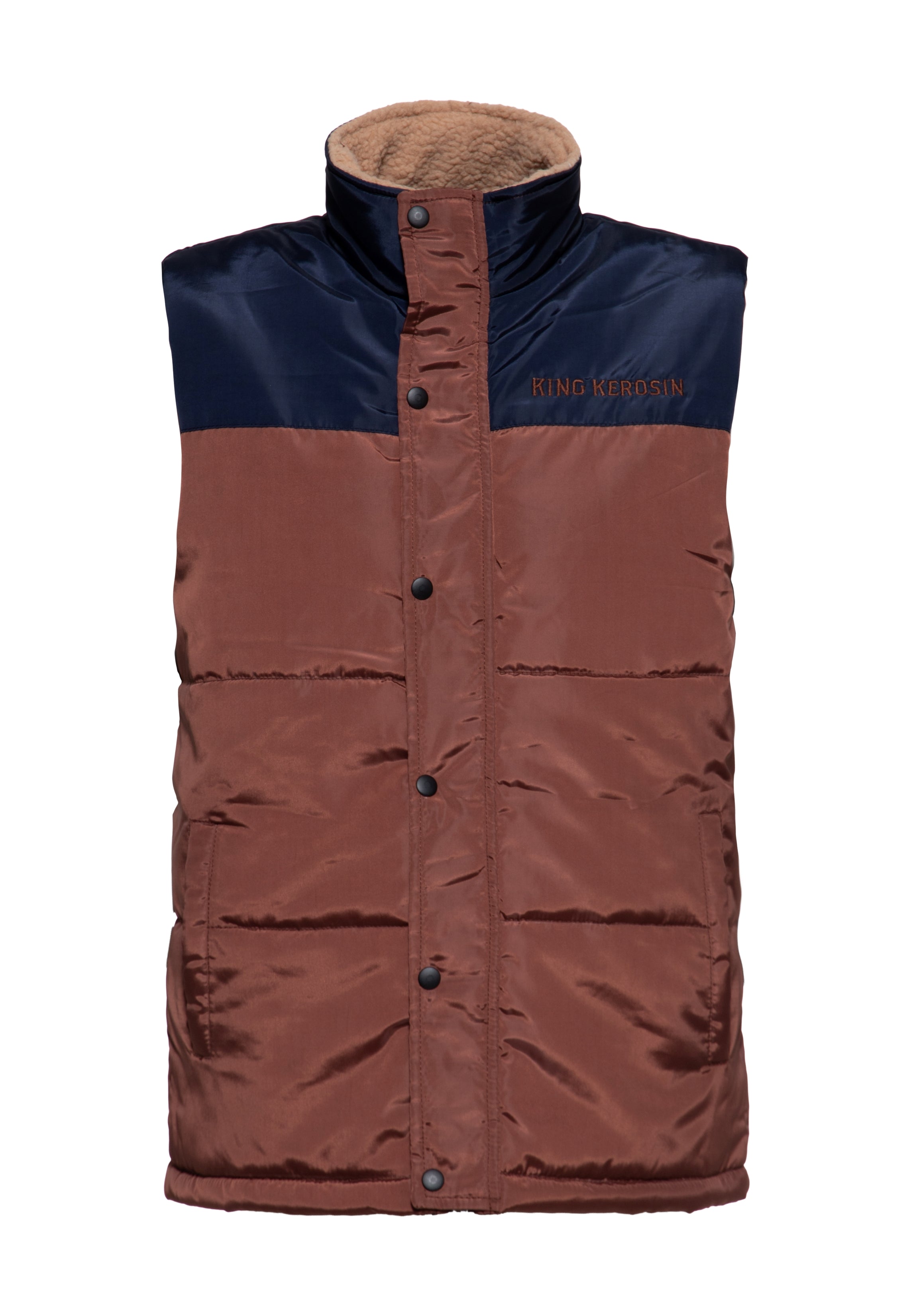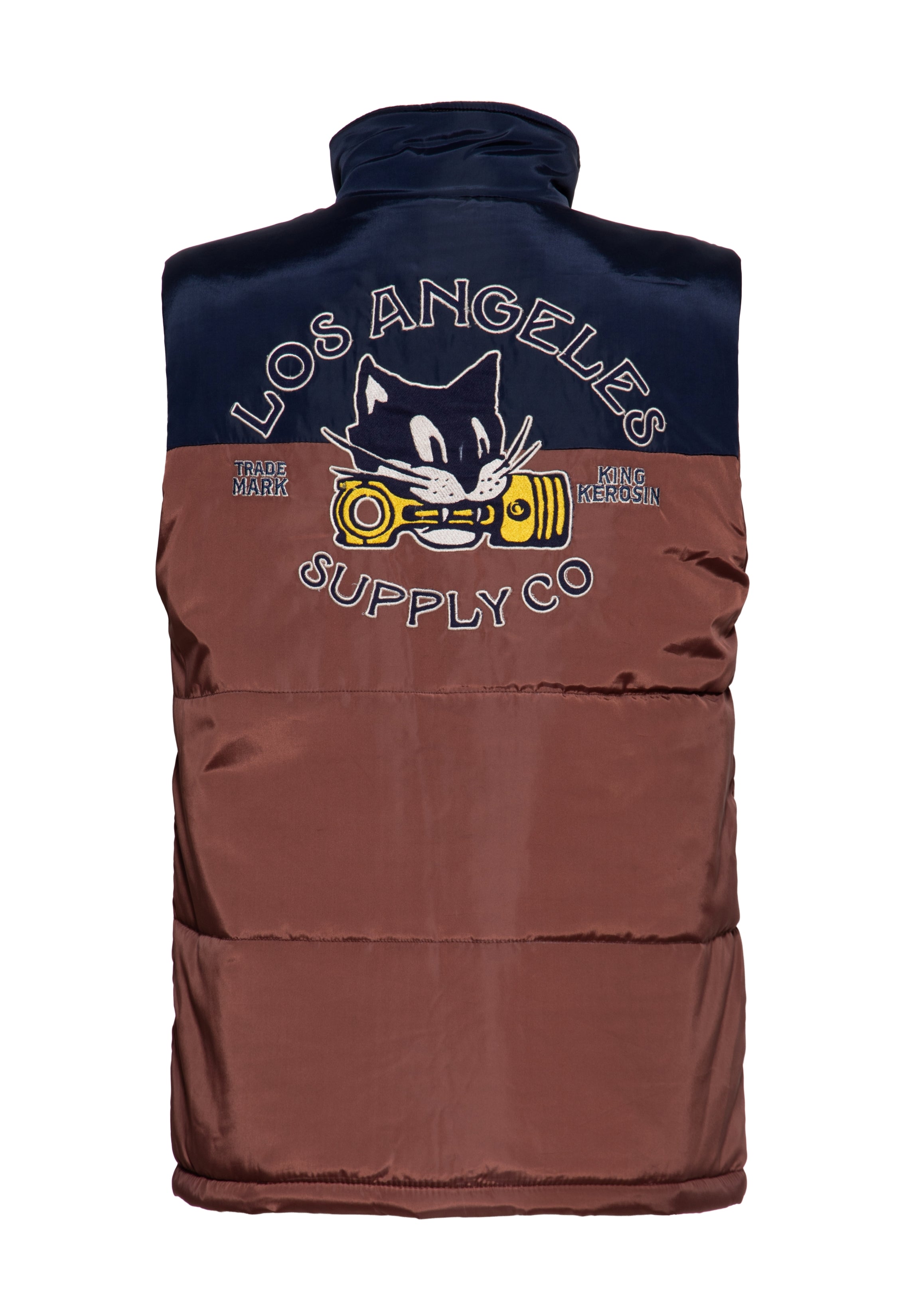 Die King Kerosin Weste bringt echtes Los Angeles-Feeling in deinen Style! Highlight ist der große Stickpatch auf dem Rücken mit Cartoon-Katze und „Supply Co“-Schriftzug, der der Weste einen unverwechselbaren Look verleiht. Das zweifarbige Design in dunklem Blau und Braun macht sie vielseitig kombinierbar, während die wattierte Verarbeitung für angenehme Wärme sorgt. Ein weiteres Detail ist der Kragen mit weichem Teddy-Futter, der nicht nur stylisch aussieht, sondern zusätzlich warm hält. Mit durchgehendem Reißverschluss ist sie praktisch und ein echtes Must-have für alle, die den King Kerosin Spirit leben und Wert auf markante Details legen.