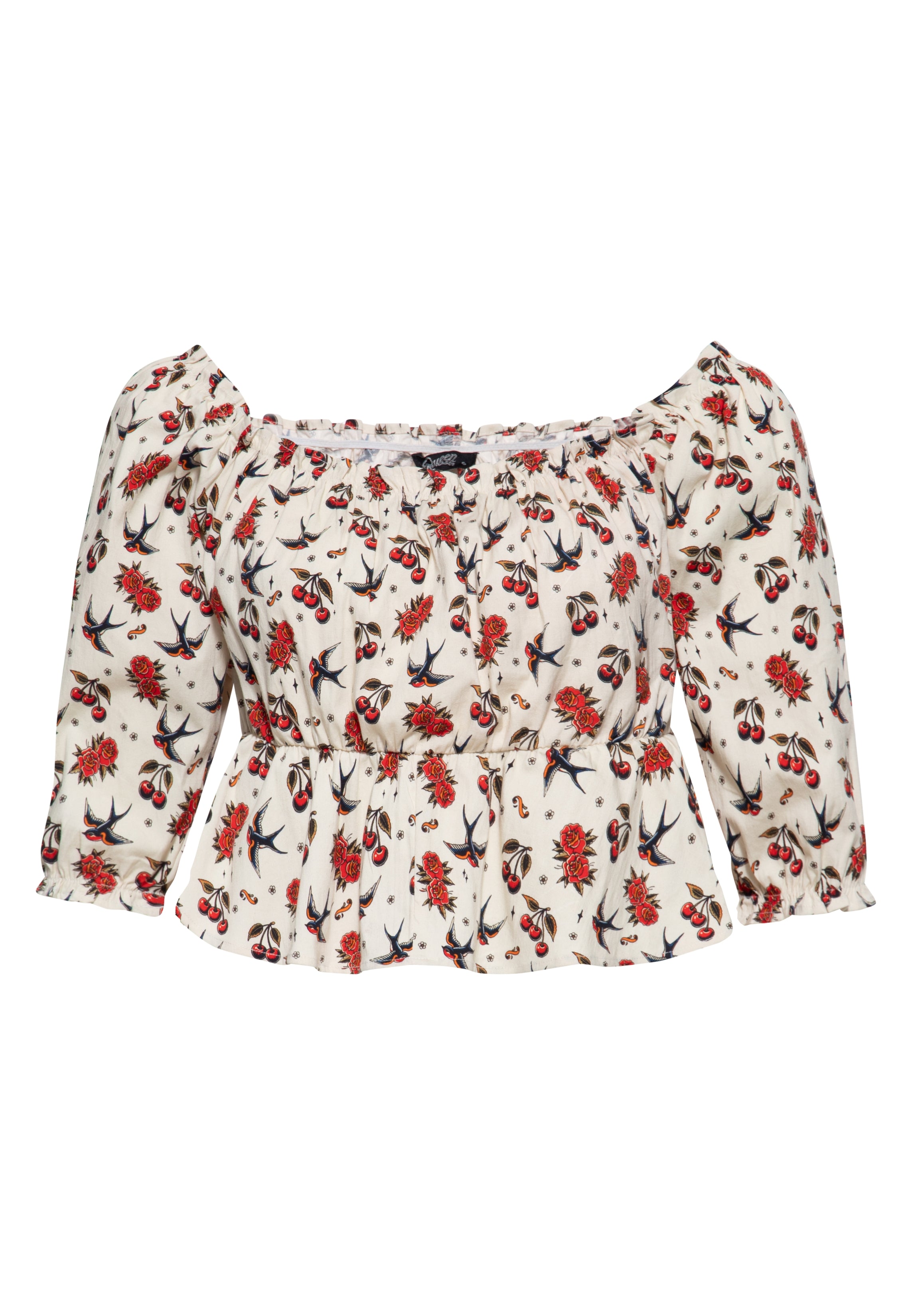 Eine Ode an den klassischen Tattoo-Stil: Die Queen Kerosin Bluse bringt mit Schwalben, Kirschen und Rosen echtes Rockabella-Flair in deinen Look. Der Carmen-Ausschnitt mit elastischer Raffung setzt das Dekolleté gekonnt in Szene und lässt sich schulterfrei tragen. Dank der Taillennaht mit leicht ausgestelltem Volant entsteht eine feminine Silhouette mit nostalgischem Charme. Die Ärmel mit Puff-Effekt und zarten Raffungen betonen den Vintage-Look und sorgen für Bewegungsfreiheit – perfekt für heiße Sommertage, Picknick auf zwei Rädern oder das nächste Rock’n’Roll-Event.