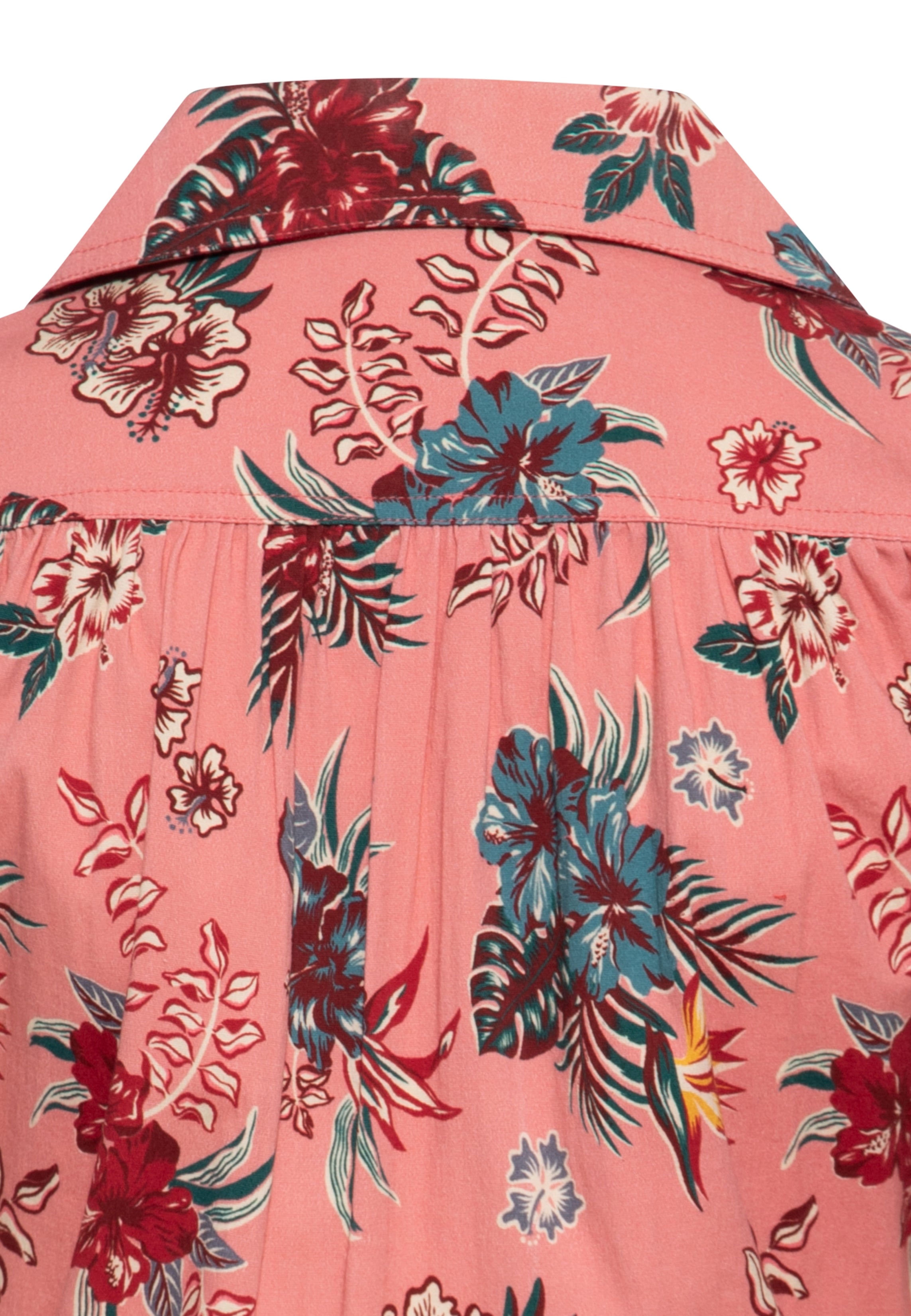 Hibiskus soweit das Auge reicht – diese Cropped-Hawaiibluse bringt sofort gute Laune in deinen Look. Der Reverskragen und die fixierten Ärmelumschläge setzen entspannte Akzente, während die durchgehende Knopfleiste mit Holzoptik-Knöpfen den Vintage-Flair unterstreicht. Die zarte Raffung unter der Rückenpasse verleiht dem Shirt eine lockere Passform und sorgt für Bewegungsfreiheit. Gefertigt aus reiner Bio-Baumwolle – perfekt für heiße Tage und coole Styles.