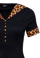 Ein Hauch von Wildheit trifft auf eleganten 50s-Swing! Dieses Queen Kerosin Kleid bringt mit seinem großzügig ausgestellten Rock und den auffälligen Leo-Akzenten am Revers und an den Ärmeln ordentlich Schwung in deinen Vintage-Look. Die stoffbezogenen Knöpfe setzen charmante Akzente, während der elastische Materialmix für eine feminine Passform mit viel Bewegungsfreiheit sorgt. Ob Tanzfläche oder Dinner-Date – hier wird jede Drehung zum Statement.