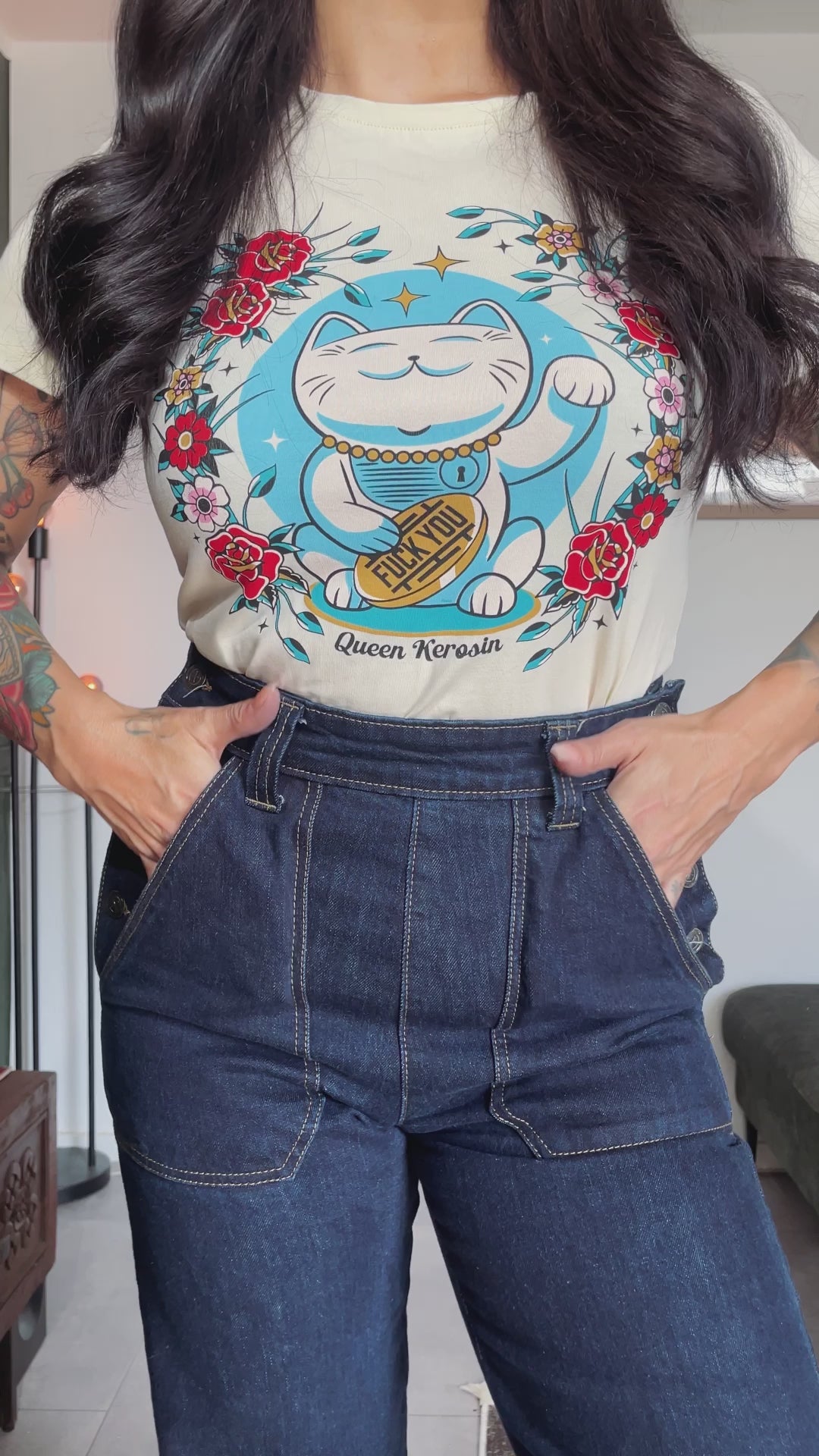 Dieses Queen Kerosin T-Shirt mit frecher Winkekatze ist dein persönlicher Mittelfinger mit Blümchenrahmen – ein Statement zwischen Glücksbringer und „Don’t mess with me“. Der körpernahe Slim Fit, der klassische Rundhalsausschnitt und der bequeme Baumwoll-Elastan-Mix sorgen dafür, dass es nicht nur optisch überzeugt, sondern sich auch verdammt gut trägt. Für Frauen, die lieber selbst das Steuer in die Hand nehmen – mit Stil und einem Augenzwinkern.