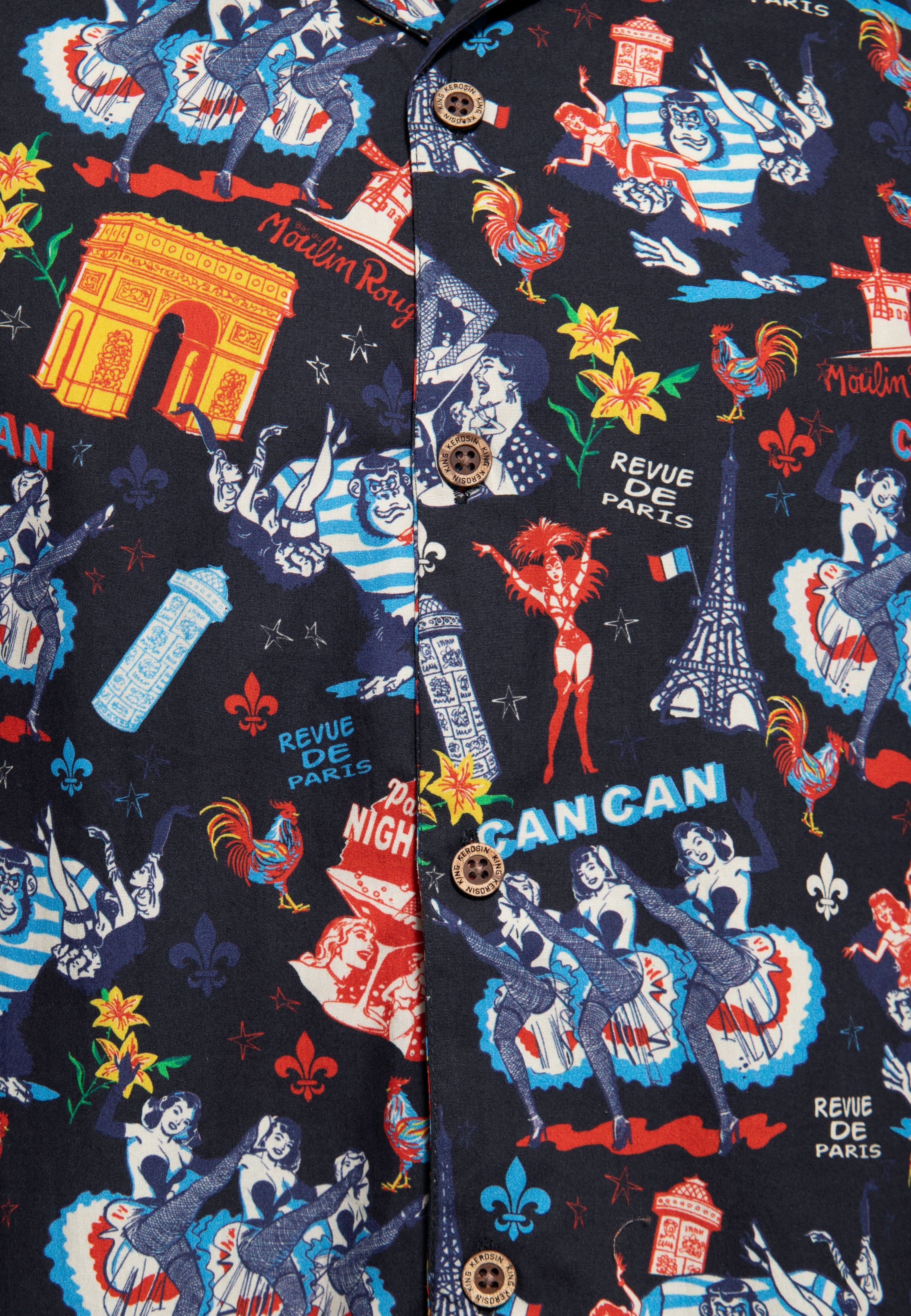 Aus nachhaltiger Biobaumwolle hergestellt und in einer GOTS-zertifizierten Produktionsstätte produziert, bietet dieses Hemd mit seinem Regular Fit hohen Tragekomfort und bleibt dabei umweltbewusst. Der Reverskragen und die Knöpfe aus Holz runden das Vintage-Gefühl ab. Auf dem Hemd prangen der majestätische Eiffelturm und der triumphale Arc de Triomphe, umgeben von den verführerischen Tänzerinnen des Moulin Rouge. Hinzu kommt ein gigantischer Affe, – nennen wir ihn einfach „Monsieur Grand“ der spielerisch zwei Tänzerinnen in eine Szene voller Pariser Eleganz entführt. Dieses kreative Zusammenspiel von Symbolen macht das Hemd zu einem echten Blickfang. Ob du durch die Boulevards von Paris schlenderst oder einfach den Alltag mit einem Hauch von Kultur würzen möchtest, das kurzärmelige Hawaiihemd bringt französischen Charme und künstlerische Freiheit in jede Situation. Lass dich von diesem Hemd inspirieren und zeige deine Liebe für die Stadt der Kunst und der Liebe auf die verspielteste Art und Weise.