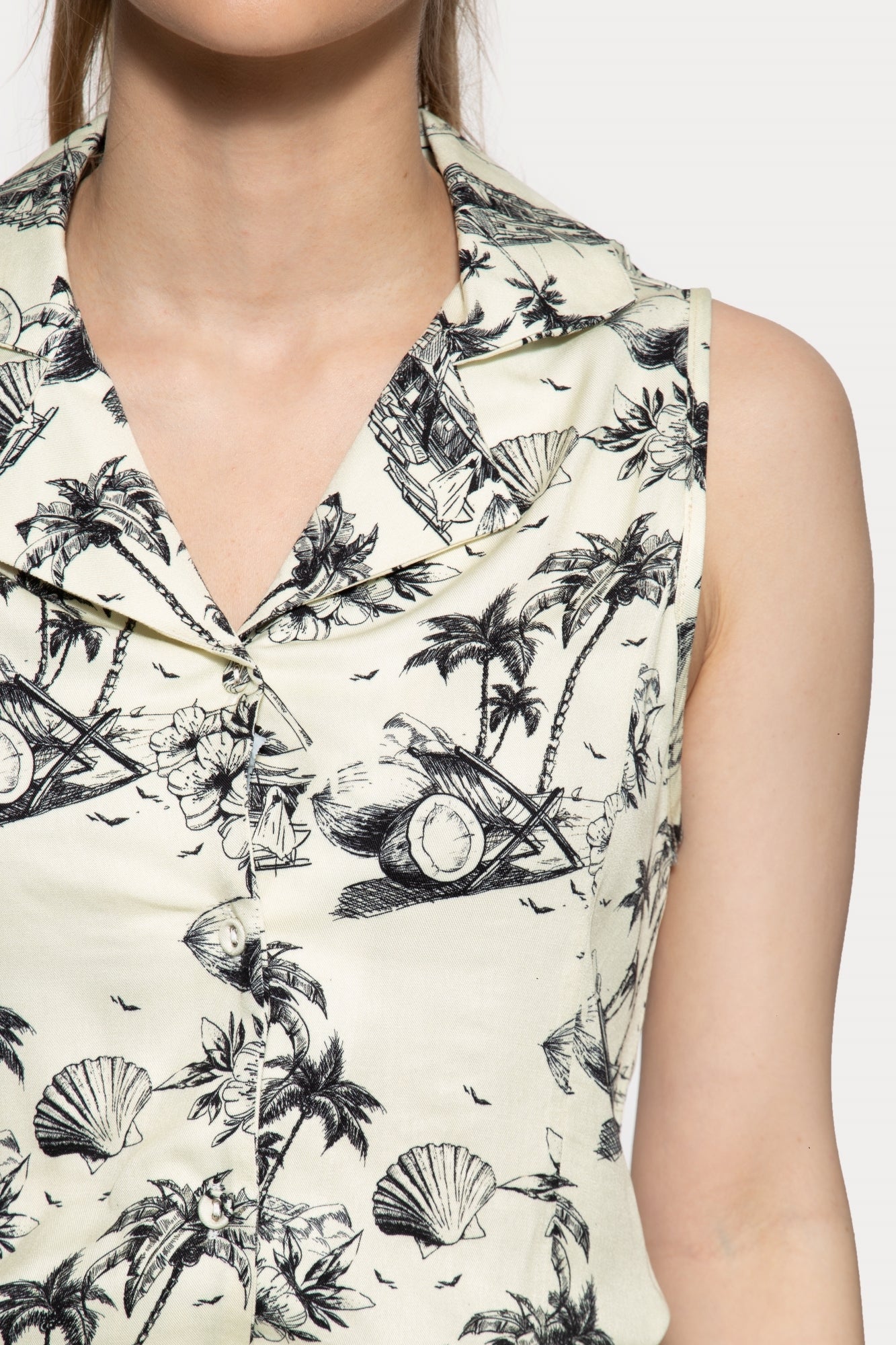 Ein komplettes Outfit mit nur einem Teil? Kein Problem für den Queen Kerosin Jumpsuit! Der Damen Jumpsuit beeindruckt direkt mit seinem sommerlichen All-Over Muster. Das verwendete Material besteht aus reiner Viskose, was sich leicht und weich auf der Haut anfühlt und sich zusammen mit dem bequemen Regular Fit bestens für den Sommer eignet. Der ärmellose Jumpsuit besitzt formgebende Wiener Nähte, einen Reverskragen, eine Knopfleiste in der Front und einen Bindegürtel in der Taille. Für einen angenehmes, unkompliziertes An- und Ausziehen befindet sich ein nahtverdeckter Reißverschluss in der Seitennaht. Ein echter Allrounder, der in keiner Garderobe eines Vintage-Fans fehlen sollte!