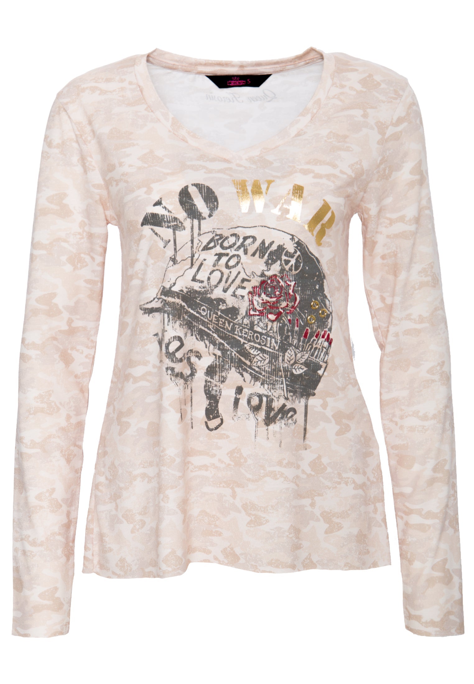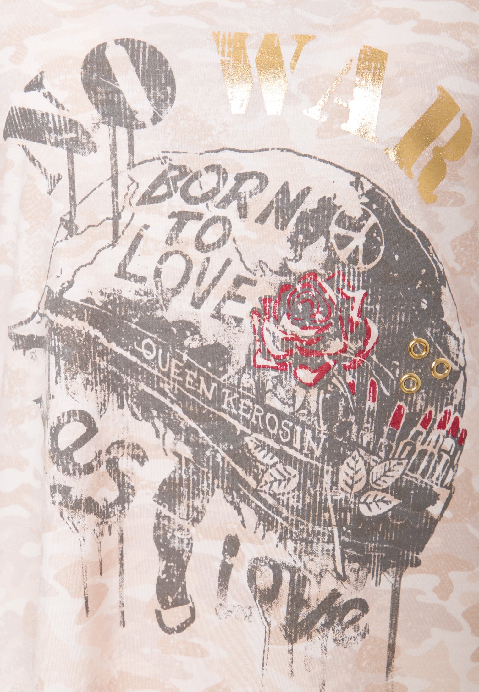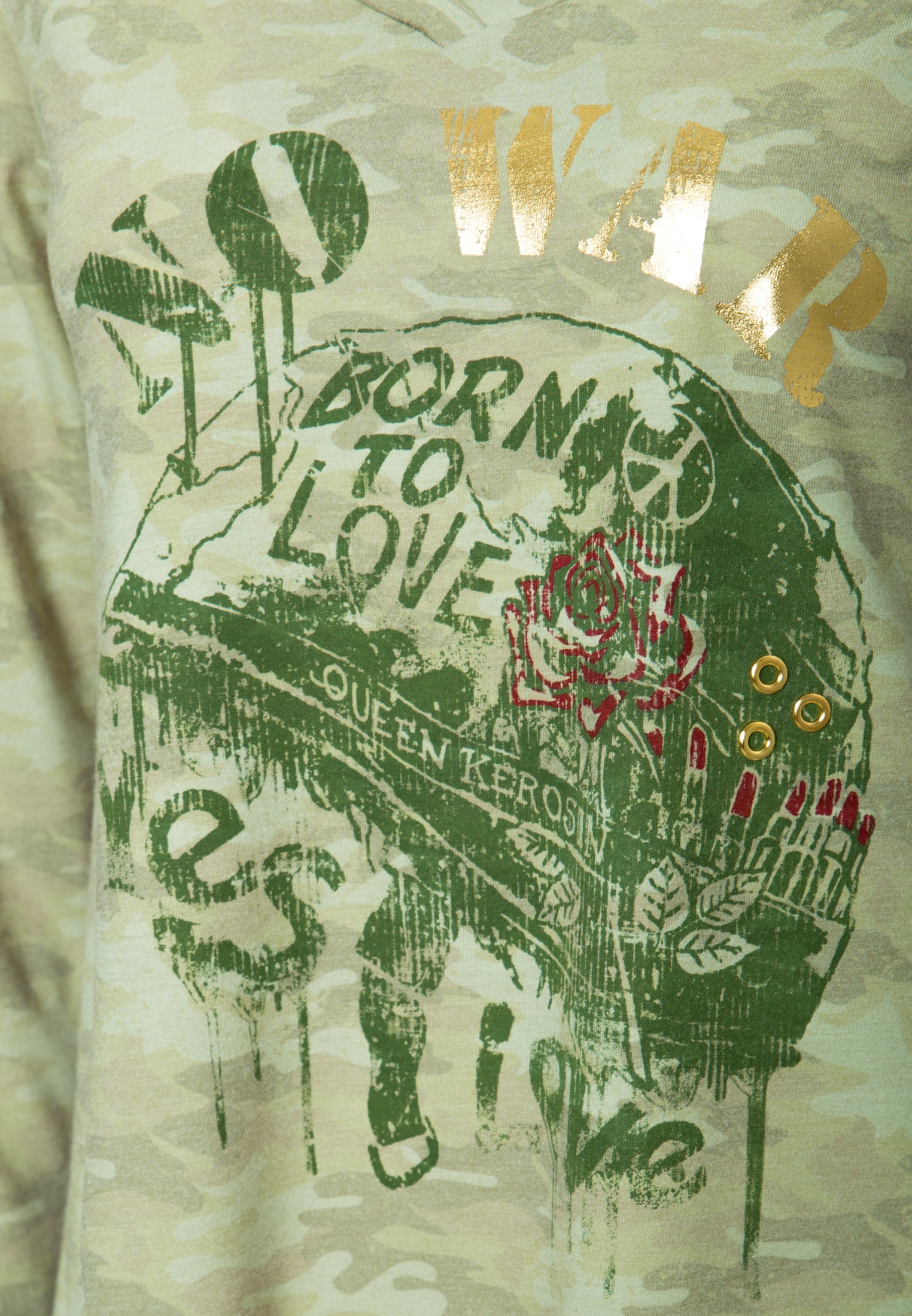 Das »born to love« Queen Kerosin Langarmshirt in hochwertigem Material-Mix begeistert durch eine weich-fließende Qualität und hohen Tragekomfort. Das leicht ausgestellte Modell, die offen gearbeiteten Abschlüsse an den Ärmeln und am Saum verleihen dem Shirt eine stylishe Note, die besonders gut in Kombination zu Jeans oder Shorts zur Geltung kommen. Der Print ist nicht nur mit Liebe zum Detail gestaltet, er setzt auch ein klares Statement »NO WAR, YES LOVE« Dieser Longsleeve von der Kultmarke Queen Kerosin ist ein absolutes Must-Have.