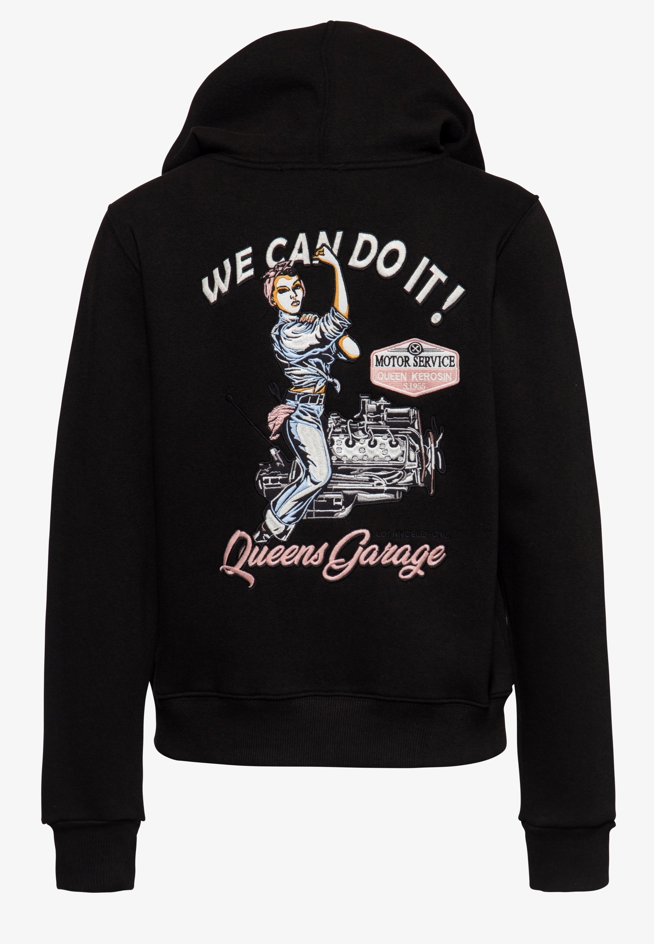 We can do it! Gemeinsam schaffen wir alles! Die Queen Kerosin Sweatjacke überzeugt mit ihrer detaillierten Stickerei im Rücken und dem Brustpatch jeden Vintage-Begeisterten. Eine bequeme Passform im Regular Fit sorgt zusammen mit der hautfreundlichen Maschenware mit aufgerauter, weicher Innenseite für einen angenehmen Tragekomfort. Der Basic Zip Hoodie besitzt eine Kapuze mit Kordelzug und eine Kängurutasche in der Front. Rippbündchen an den Ärmeln und am Saum schaffen zudem einen gemütlichen Sitz. Ein super Allrounder, den du vielseitig kombinieren und einsetzen kannst.